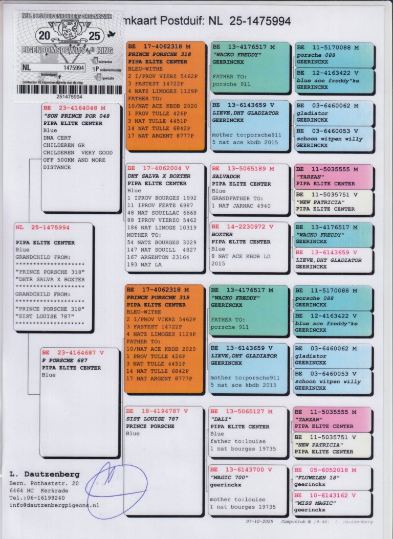 Uit: “The 048”, zoon “Prince Porsche”, 3.-14.722d., vader 10. Nat. Asduif KBDB, broer “Porsche 911” & dochter “Salvador & Boxter” x “The 687”, dochter “Prince Porsche” & “Sister Louise”.
