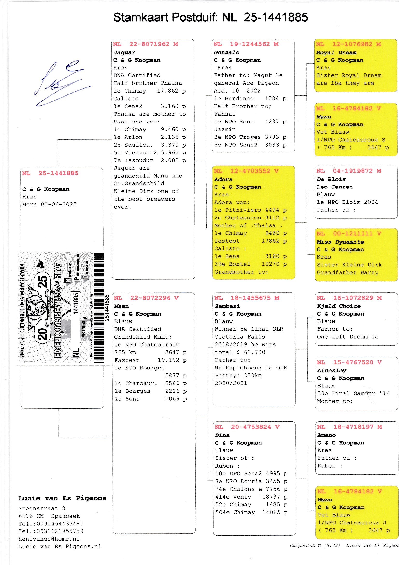 Uit: ”Jaguar”, 1/2 broer ”Thaisa”, 1. Prov. Chimay 17.862 d., ”Calisto”, 1. NPO Sens 3.160 d., uit zoon ”Royal Dream” & ”Manu”, 2x 1. Nat. Winnaar x ”Maan”, uit dochter ”Manu”, 1. Nat. Chateauroux 19.192 d., 1. Nat. Bourges 5.877 d.