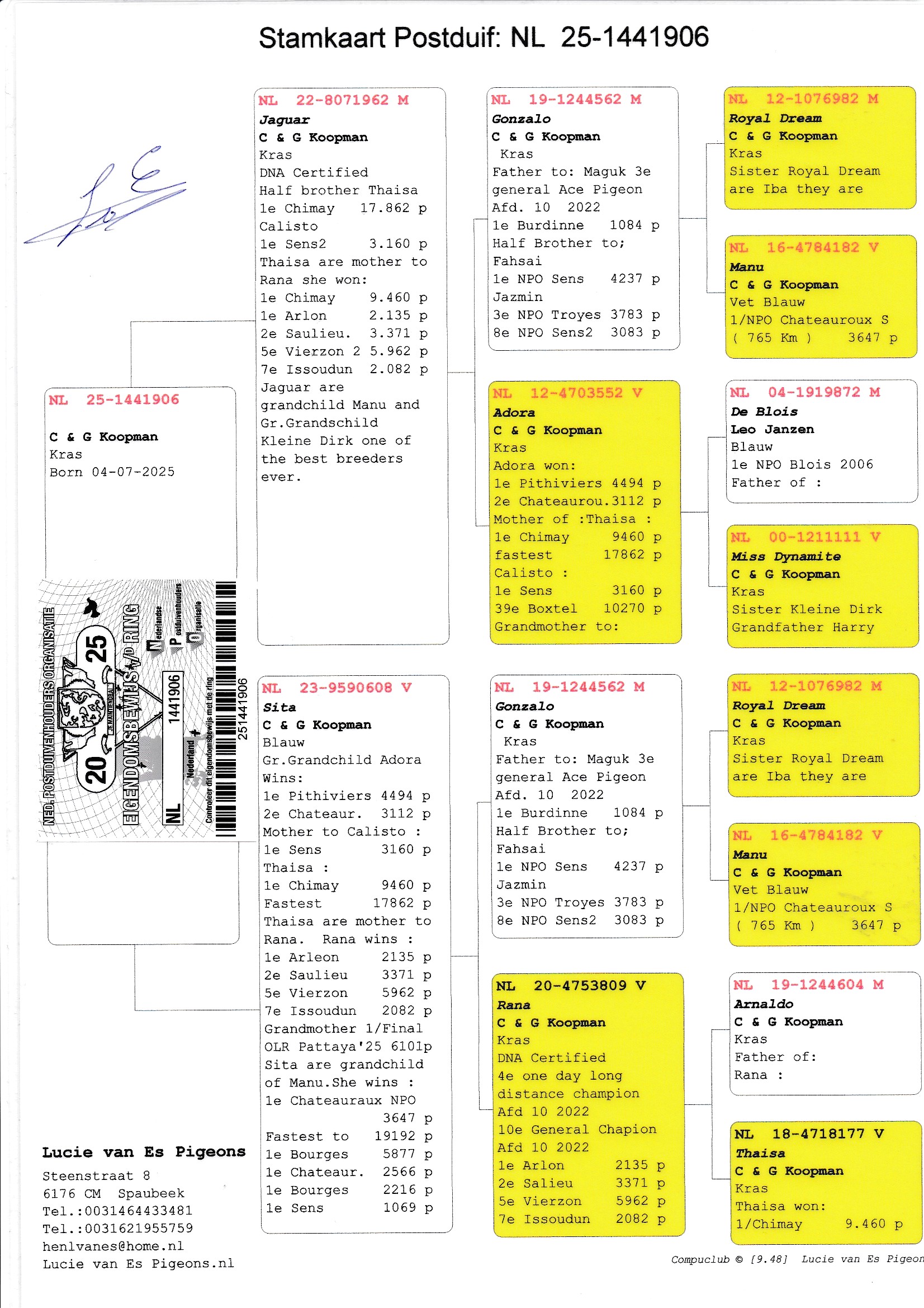 Uit: ”Jaguar”, 1/2 broer ”Thaisa”, 1. Prov. Chimay 17.862 d., ”Calisto”, 1. NPO Sens 3.160 d., uit zoon ”Royal Dream” & ”Manu”, 1. Nat. Chateauroux & 1. Nat. Bourges x ”Sita”, dochter ”Rana”, 1.-2.135 d., 2.-3.371 d., 2.-5.962 d.