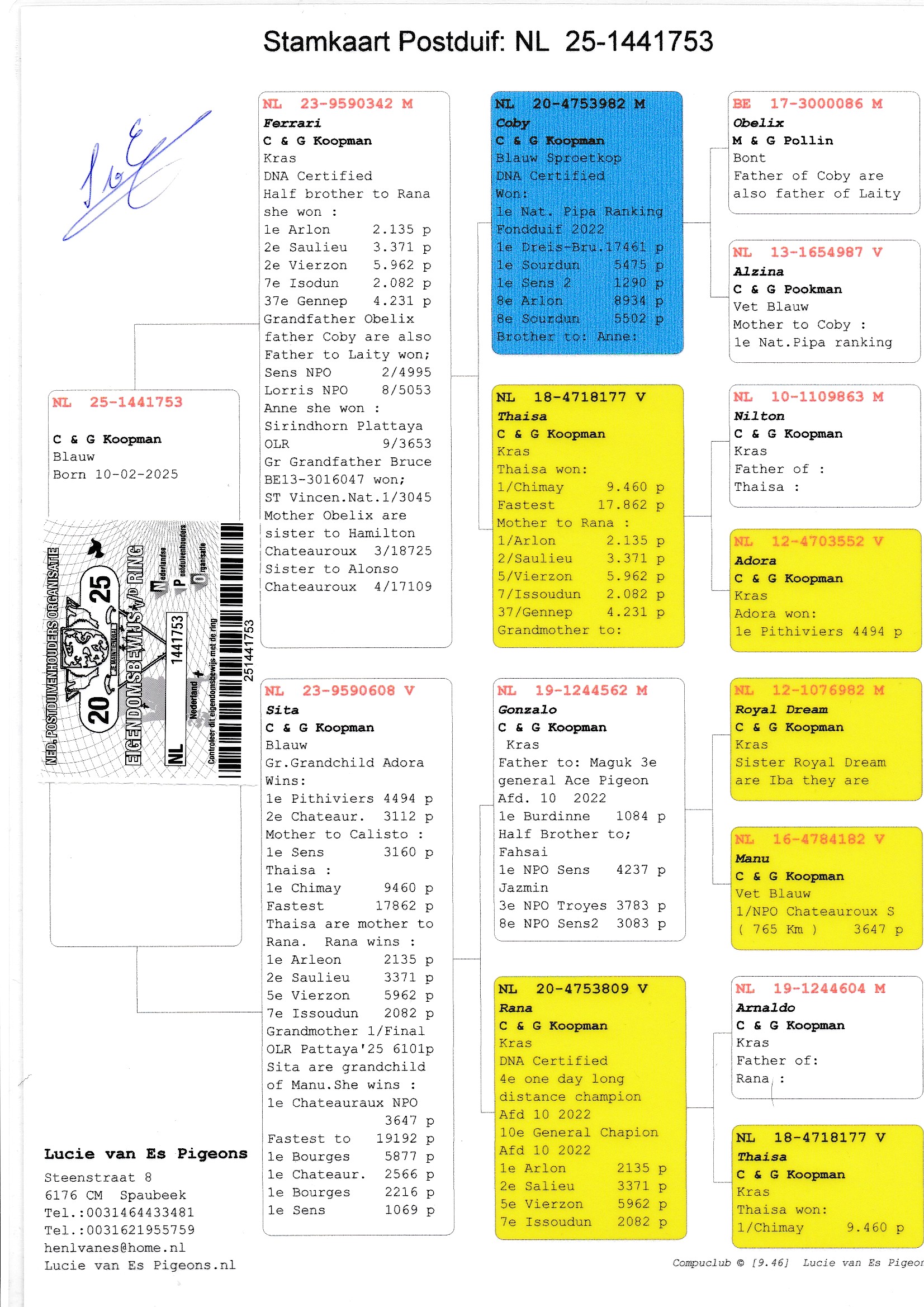 Uit: ”Ferrari”, zoon ”Coby”, 1. Nat. Asduif Dagfond PIPA-Rankings, 1. Prov. Dreis-Brück 17.461 d., 1. NPO Sourdun 5.475 d., zoon ”Thaisa”, 1. Prov. Chimay 17.862 d. x ”Sita”, uit zoon ”Manu”, dochter ”Rana”, 4. Prov. Asduif