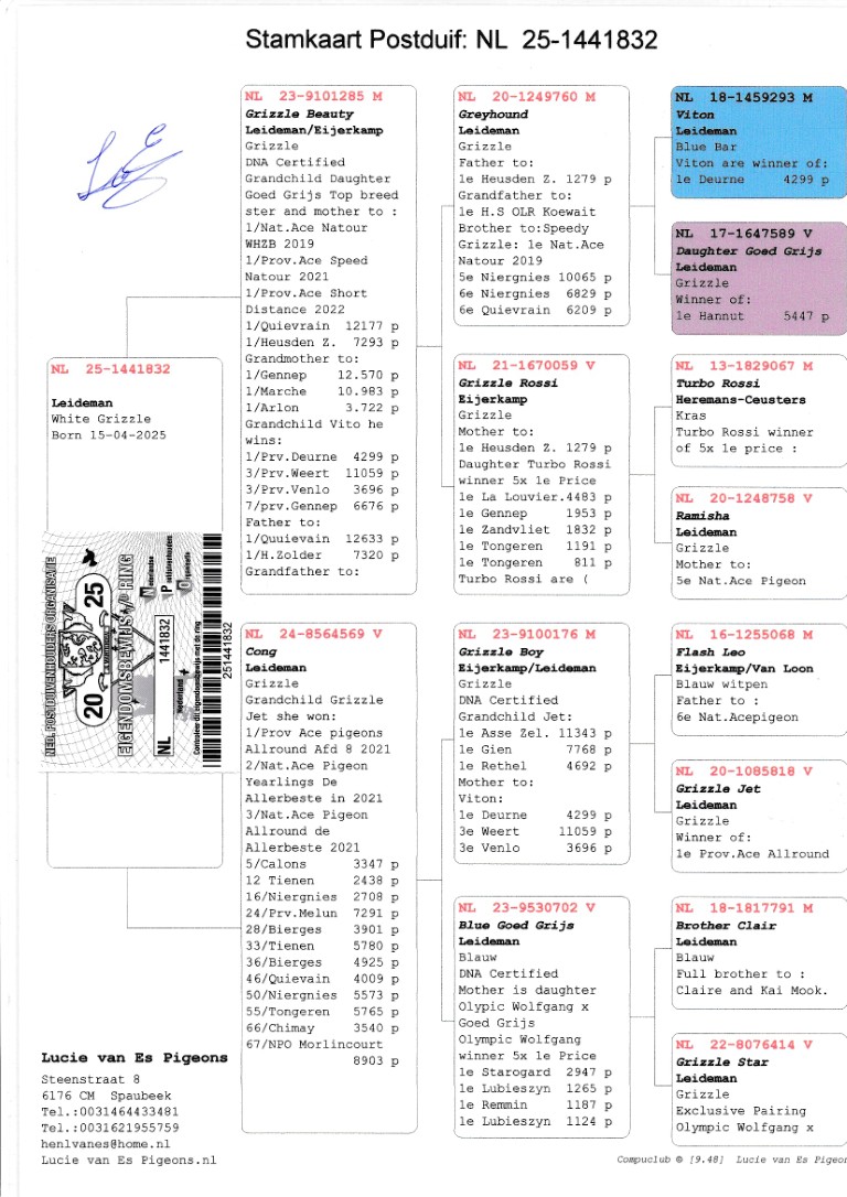 Uit: ”Grizzle Beauty”, uit dochter ”Turbo Rossi”, 5x 1. Prijs, uit broer ”Speedy Grizzle”, 1. Nat. Asduif WHZB x ”Cong”, uit kld. ”Goed Grijs”, 7x 1. Prijs & 1. NPO Laon 6.371 d., uit zoon ”Grizzle Jet”, 1. Prov. Asduif