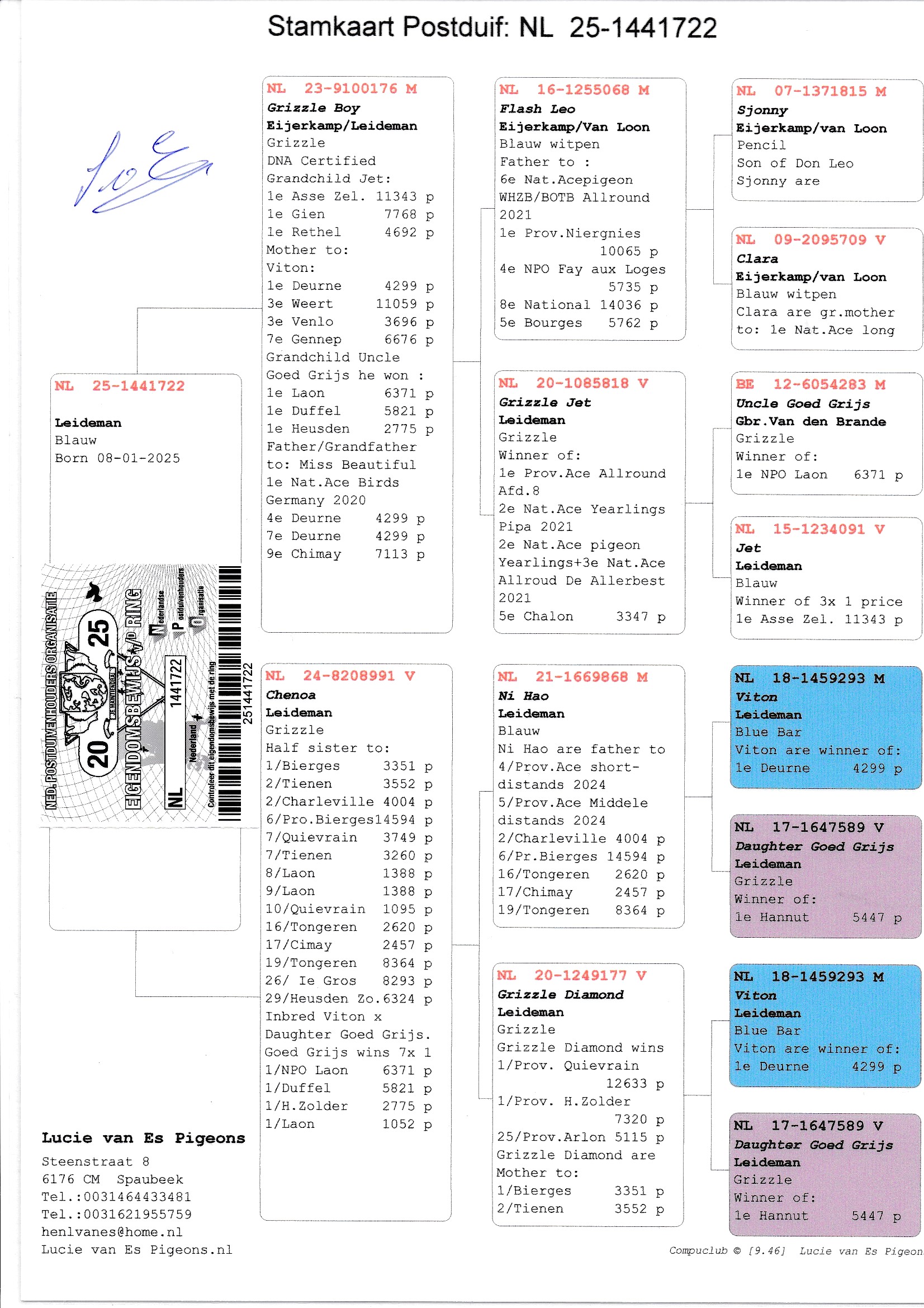 Uit: ”Grizzle Boy”, zoon ”Grizzle Jet”, 1. Prov. Asduif Allround, 2. Nat. Asduif Jaarlingen, 2. & 3. Nat. Asduif x ”Chenoa”, uit broer & zus ”Speedy Grizzle”, 1. Nat. Asduif WHZB, inteelt ”Goed Grijs”, 7x 1. Prijs