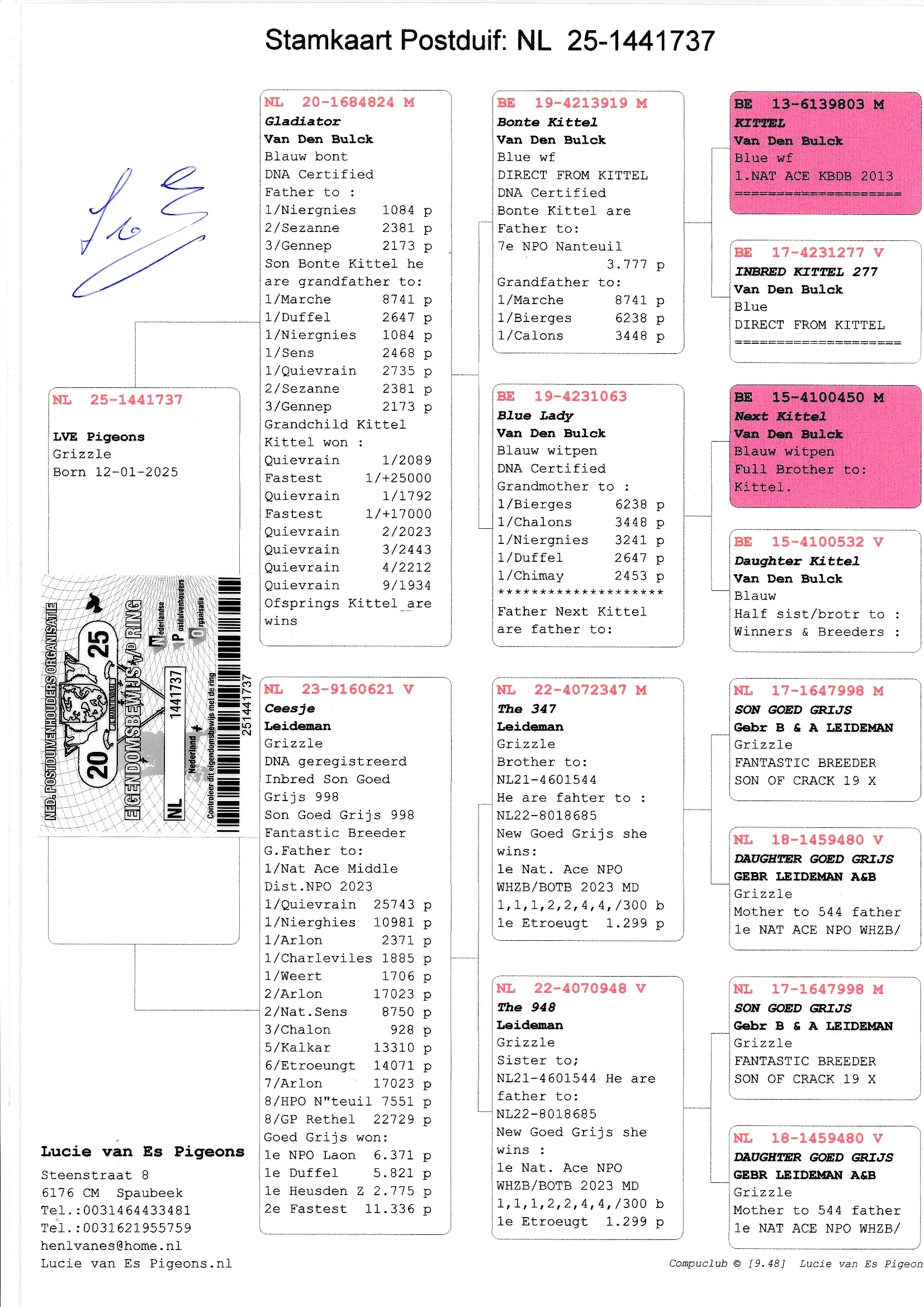 Uit: “Gladiator”, vader 1.-1.084d., 2.-2.381d., 3.-2.173d, zoon “Bonte Kittel”, top kweker, zoon “Kittel” & “Blue Lady” x “Ceesje”, dochter “The 347”, broer vader 1. Nat. Asduif NPO, uit “Son & daughter Goed Grijs 998”, Gebr. Leideman.