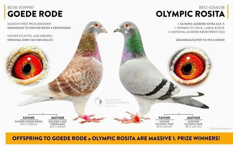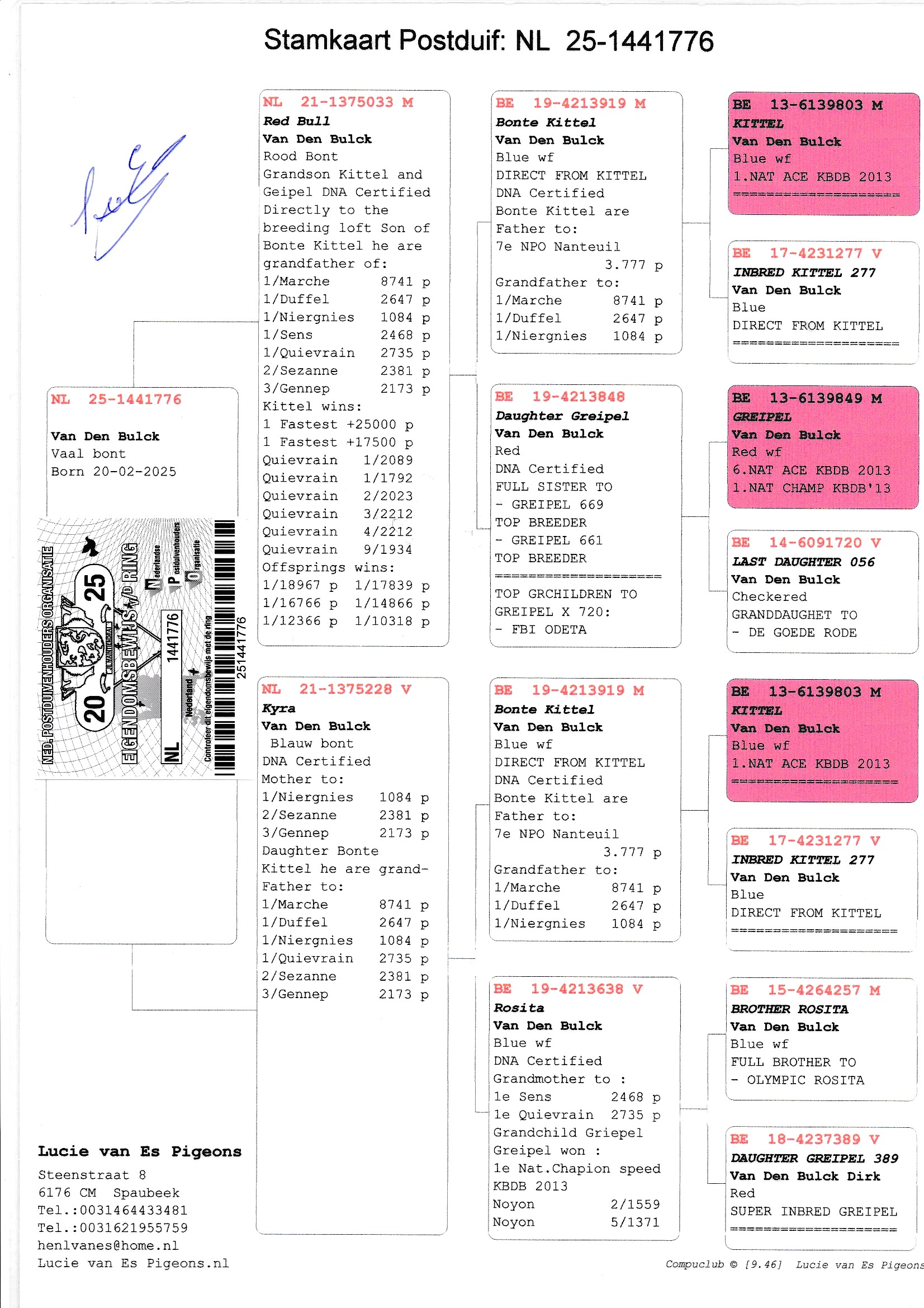 Uit: “Bonte Kittel”, zoon “Kittel”, 1. Nat. Asduif KBDB & “Inbred Kittel” & dochter “Greipel”, 6. Nat. Asduif KBDB x “Kyra”, dochter “Bonte Kittel” & “Rosita”, dochter “Brother Rosita”, 100% Dirk v.d. Bulck.