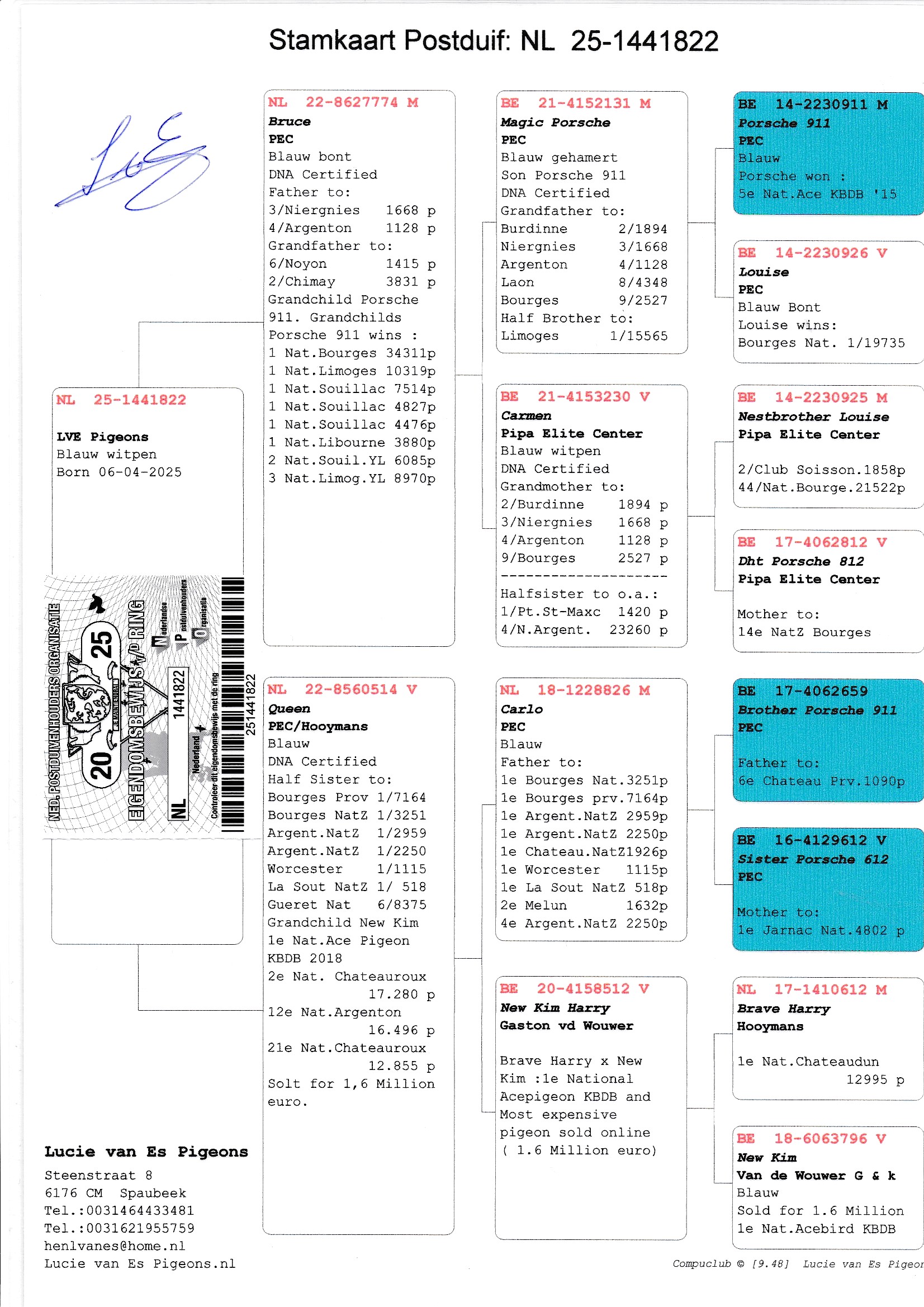 Uit: ”Bruce”, vader 3.-1.668 d., 4. Argenton 1.128 d., uit zoon ”Porsche 911”, 5. Nat. Asduif KBDB x ”Queen”, 1/2 zus 1. Prov. Bourges 7.164 d., uit dochter ”New Kim”, 1. Nat Asduif KBDB & ”Brave Harry”, 1. Nat. Chateaudun.