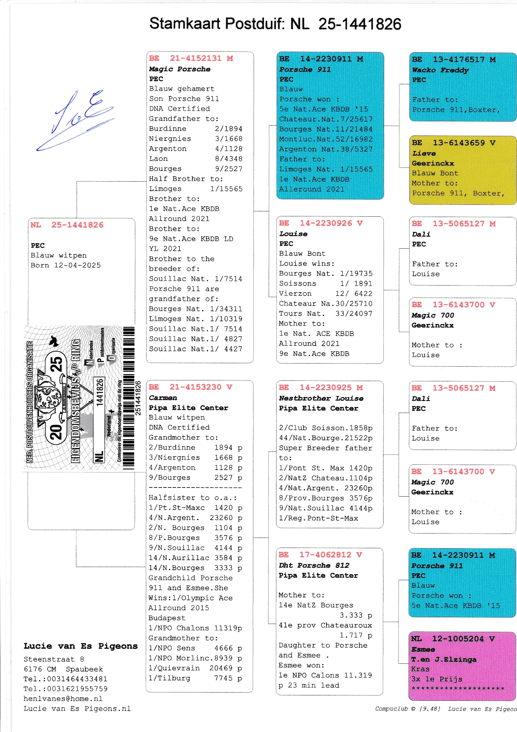 Uit: ”Magic Porsche”, gr-vader 2.-1.894 d., 3.-1.668 d., 4.-1.128 d., 1/2 broer 1. Nat. Limoges 15.565 d., zoon ”Porsche 911”, 5. Nat. Asduif KBDB & Superkweker x ”Carmen”, gr-moeder 2.-3.-4.-9. Prijs, uit dtr. ”Porsche 911”, Pipa Elite Center.