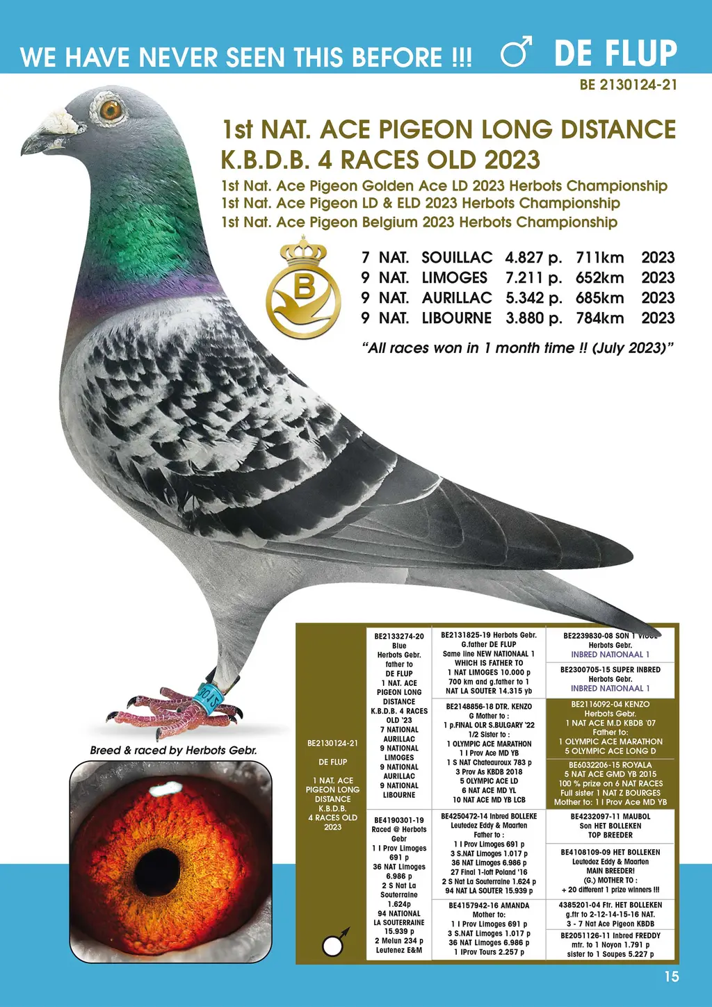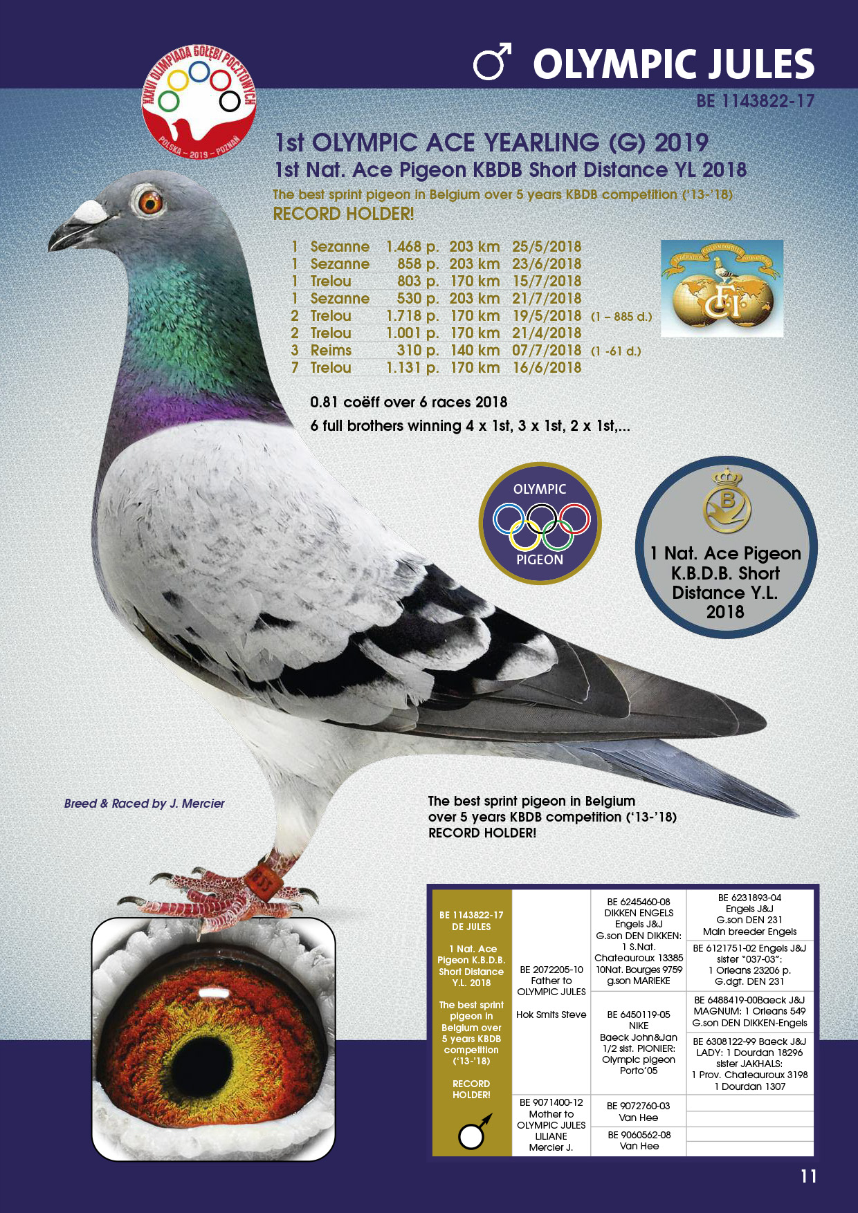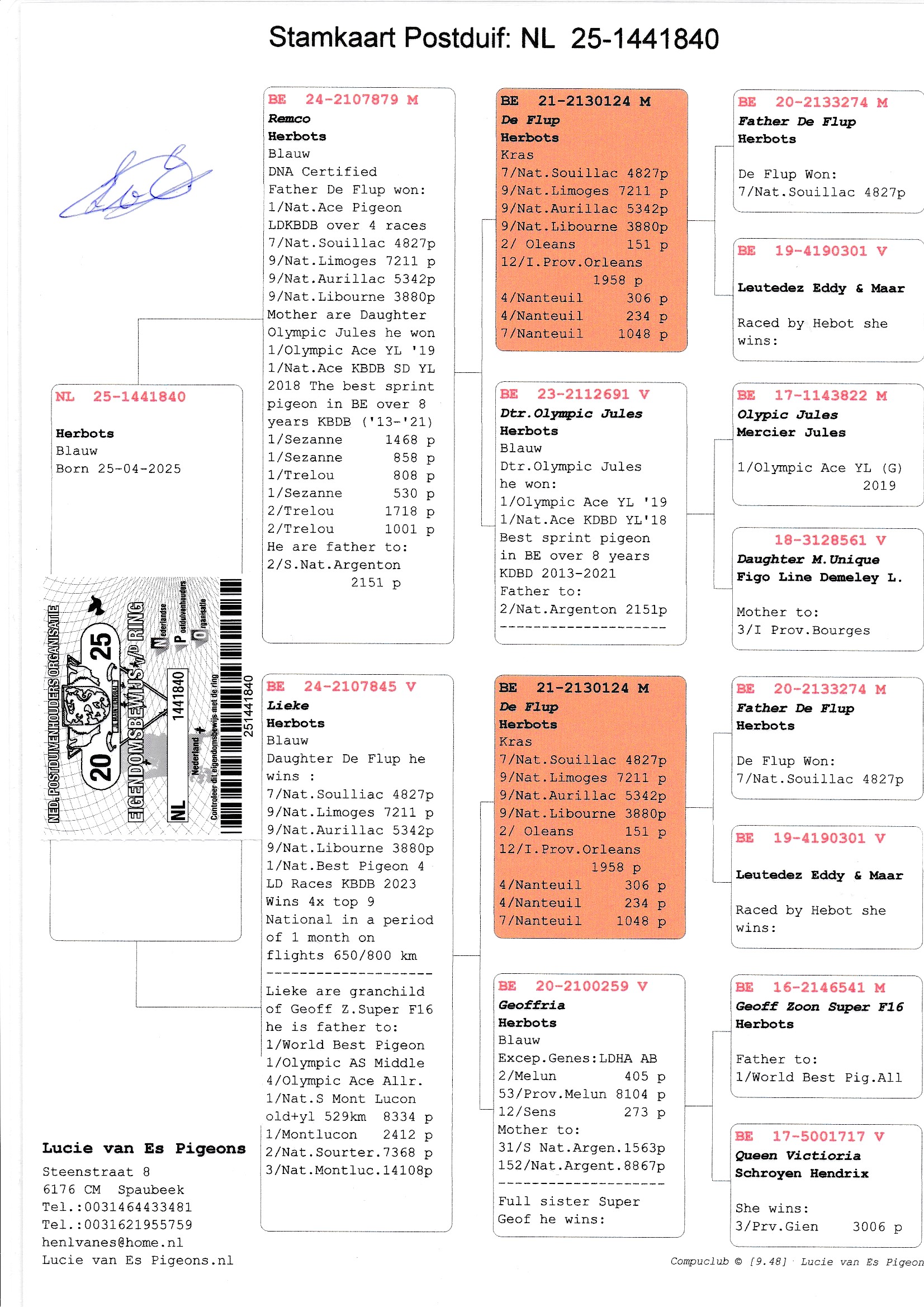 Uit: ”Remco”, zoon ”De Flup”, 1. Nat. Asduif Fond 4 vluchten, 7. Nat. Souillac, 9. Nat. Limoges, 9. Aurillac, 9. Nat. Libourne, uit dochter ”Olympic Jules” x ”Lieke”, dochter ”De Flup”, 1. Nat. Asduif & “Geoffria”.