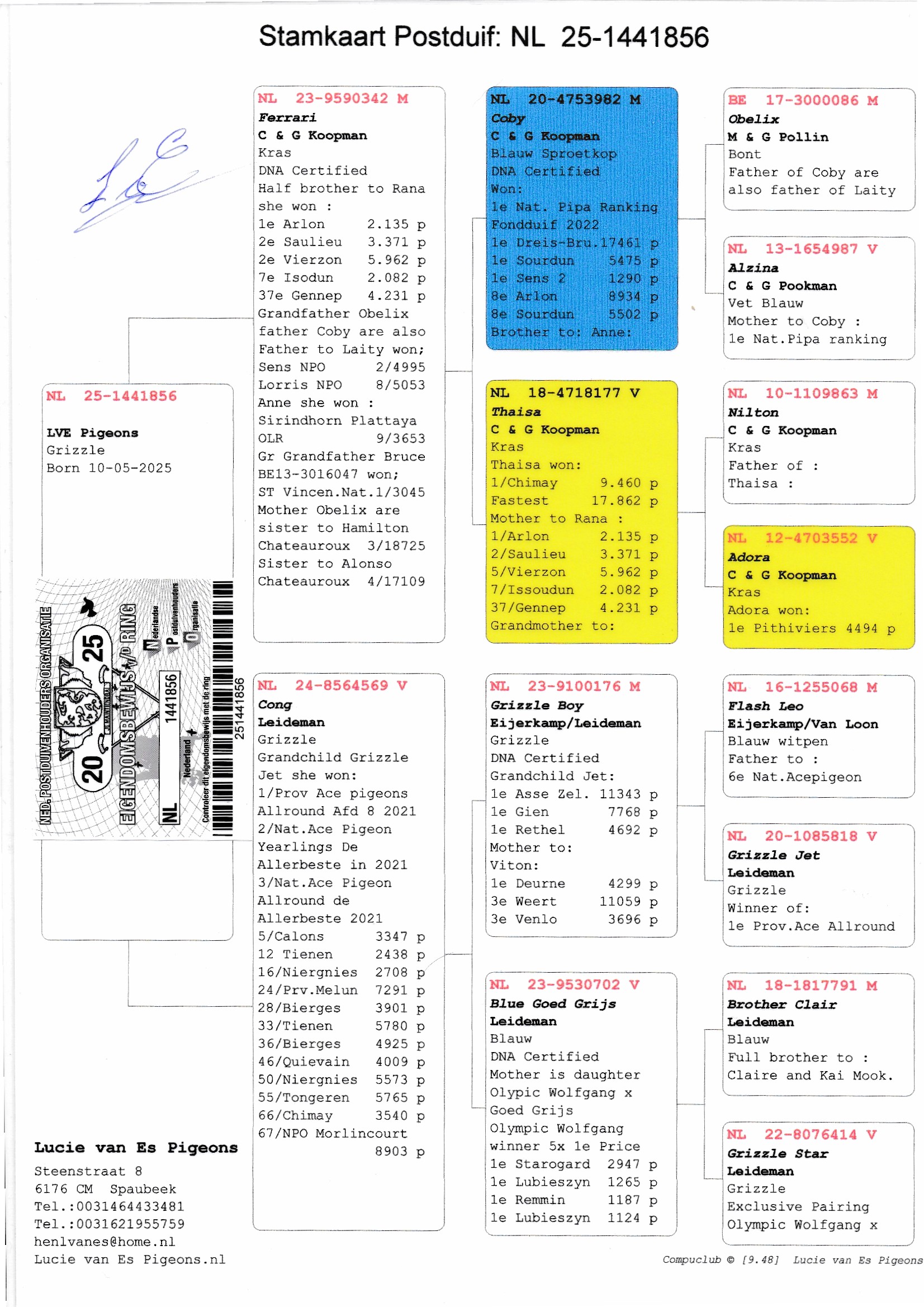 Uit: ”Ferrari”, zoon ”Coby”, 1. Nat. Asduif PIPA, 1. Prov. Dreis-Brück 17.461 d., zoon ”Thaisa”, 1. Prov. Chimay 17.862 d. x ”Cong”, uit kld. ”Goed Grijs”, 7x 1. Prijs & 1. NPO Laon 6.371 d., uit zoon ”Grizzle Jet”, 1. Prov. Asduif.