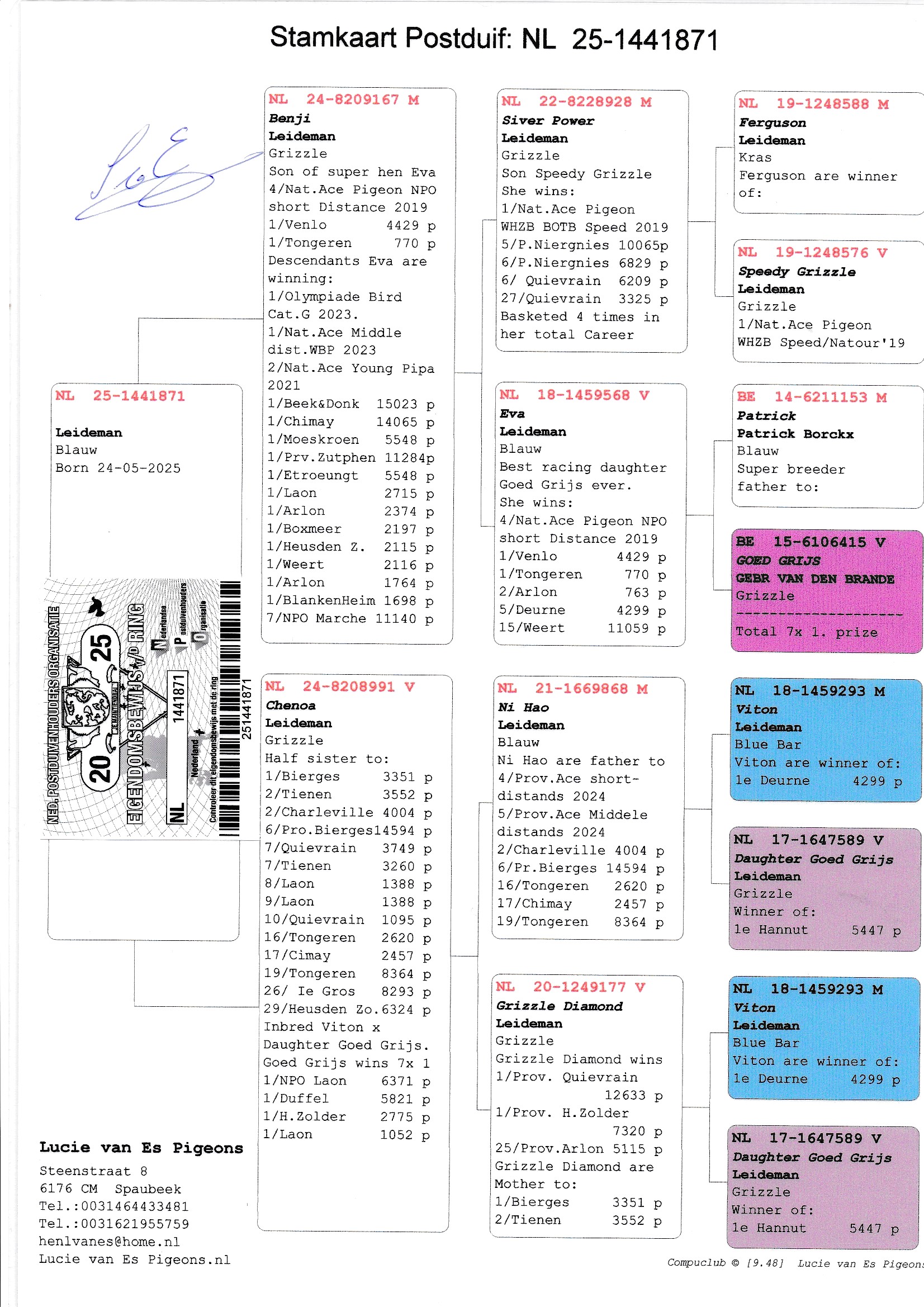 Uit: ”Benji Grizzle”, zoon ”Eva”, 4. Nat. Asduif Sprint NPO & dochter ”Goed Grijs”, 7x 1. Prijs & 1. NPO Laon 6.371 d. x ”Chenna”, inteelt dochter ”Olympic Rico”, 1. Olympiade duif Cat. Jonge Duiven, 1. Int. Asduif Jonge Duiven.