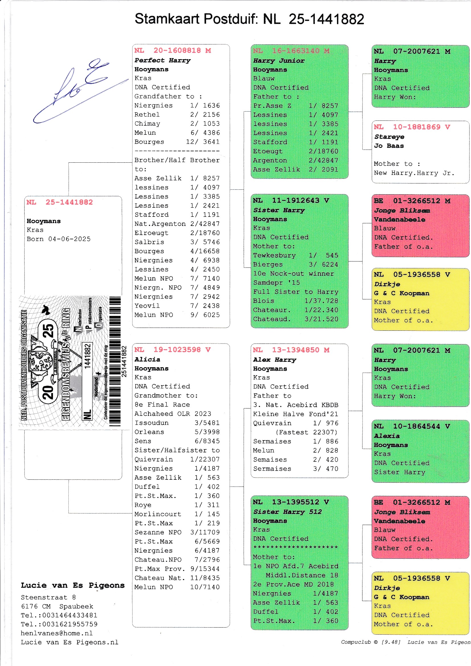 Uit: ”Perfect Harry”, gr-vader 1.-1.636 d., 2.-2.156 d., 2.-1.053 d., zoon ”Harry Junior”, uit zus ”Harry” x ”Alicia”, gr-moeder 8. Finale OLR Alchaheed 2023, 3.-5.481 d., 5.-3.998 d., 6.-8.345 d., uit zoon ”Harry” & zus ”Harry”