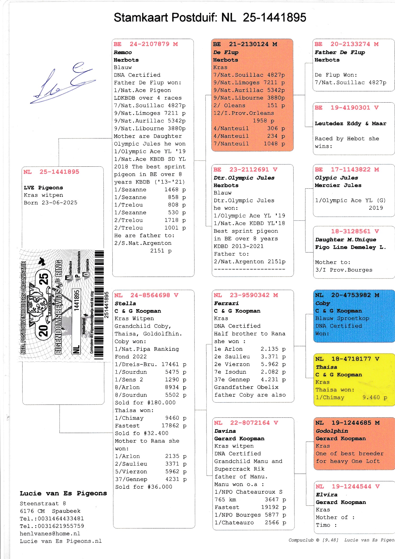 Uit: ”Remco”, zoon ”De Flup”, 1. Nat. Asduif KBDB Fond, 7. Nat. 4.827 d., 9. Nat. 7.211 d., 9. Nat. 5.342 d., 9. Nat. 3.880 d. x ”Stella”, uit zoon ”Coby”, 1. Nat. Asduif Dagfond PIPA-Rankings, uit zoon ”Thaisa”, 1. Prov. 9.460 d.