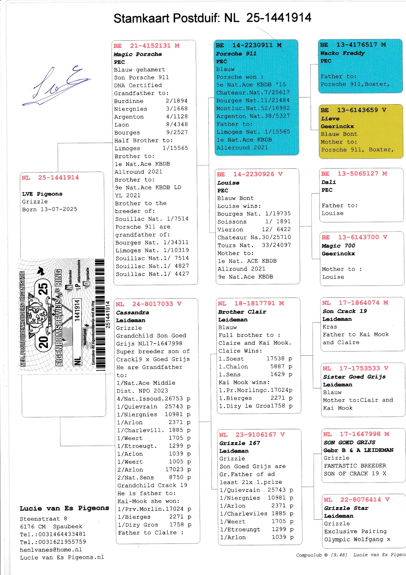 Uit: ”Magic Porsche”, zoon ”Porsche 911”, 5. Nat. Asduif KBDB & PEC Superkweker, zoon ”Louise”, 1. Nat. Bourges 19.735 d. x ”Cassandra”, uit dubbele kld. ”Goed Grijs”, 7x 1. Prijs & 1. NPO Laon 6.371 d., uit broer ”Claire”