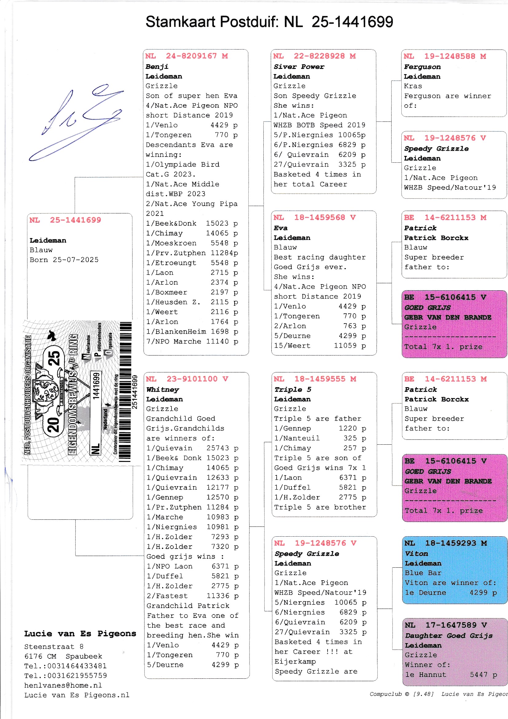 Uit: ”Benji”, zoon ”Eva”, 4. Nat. Asduif Sprint NPO & dochter ”Goed Grijs”, 7x 1. Prijs & 1. NPO Laon 6.371 d., nazaten: 7x 1. Nat. Asduif x ”Whitney”, dochter ”Speedy Grizzle”, 1. Nat. Asduif WHZB, uit zoon ”Patrick” & ”Goed Grijs”