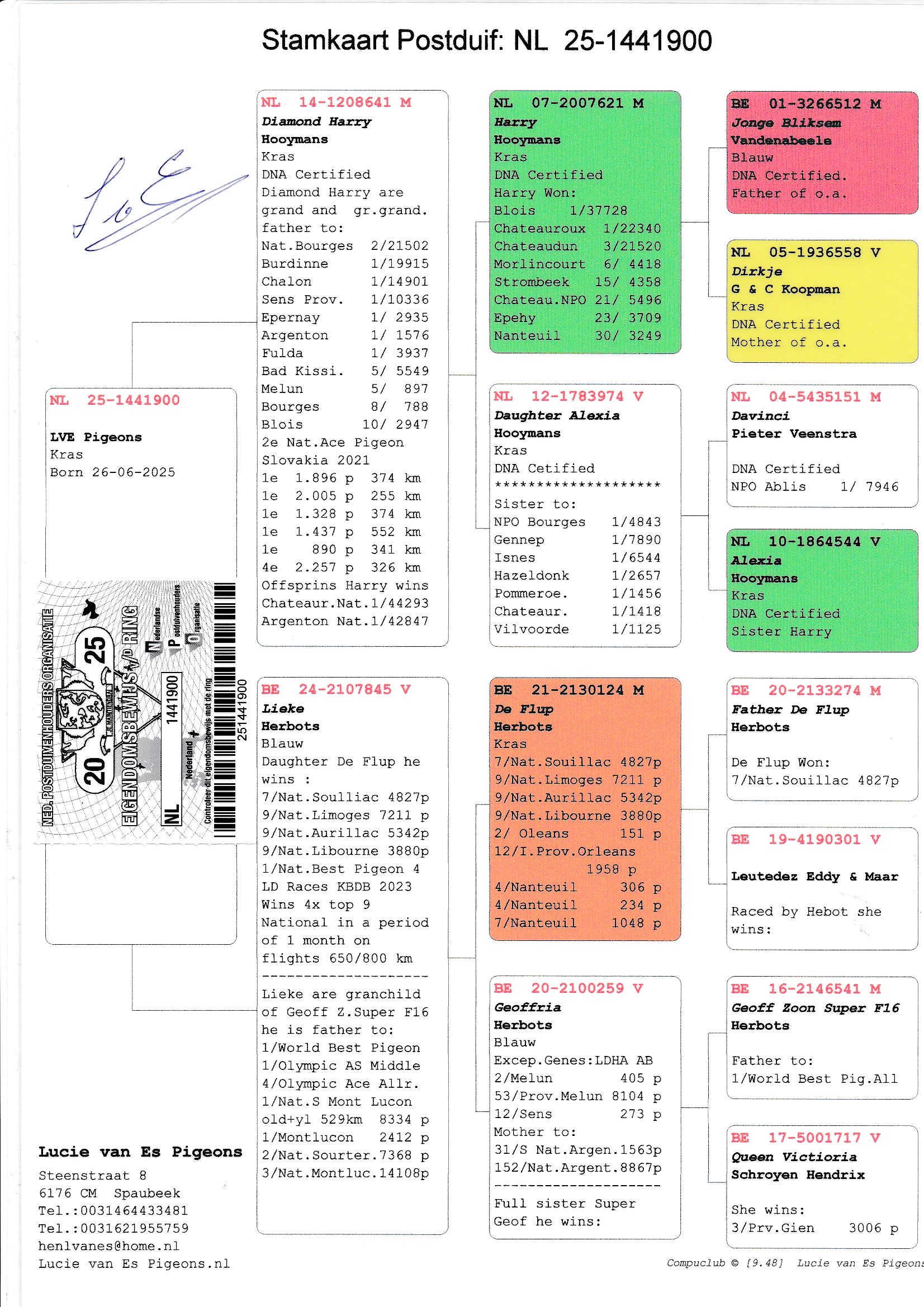 Uit: ”Diamond Harry”, nazaten: 1.-19.915 d., 1.-14.901 d., 1. Prov. 10.336 d., 1.-3.937 d., 1.-2.935 d., 1.-1.576 d., 2. Nat. 21.502 d., zoon ”Harry” x ”Lieke”, dtr. ”De Flup”, 1. Nat. Asduif, 7. Nat. Souillac, 9. Nat. Limoges