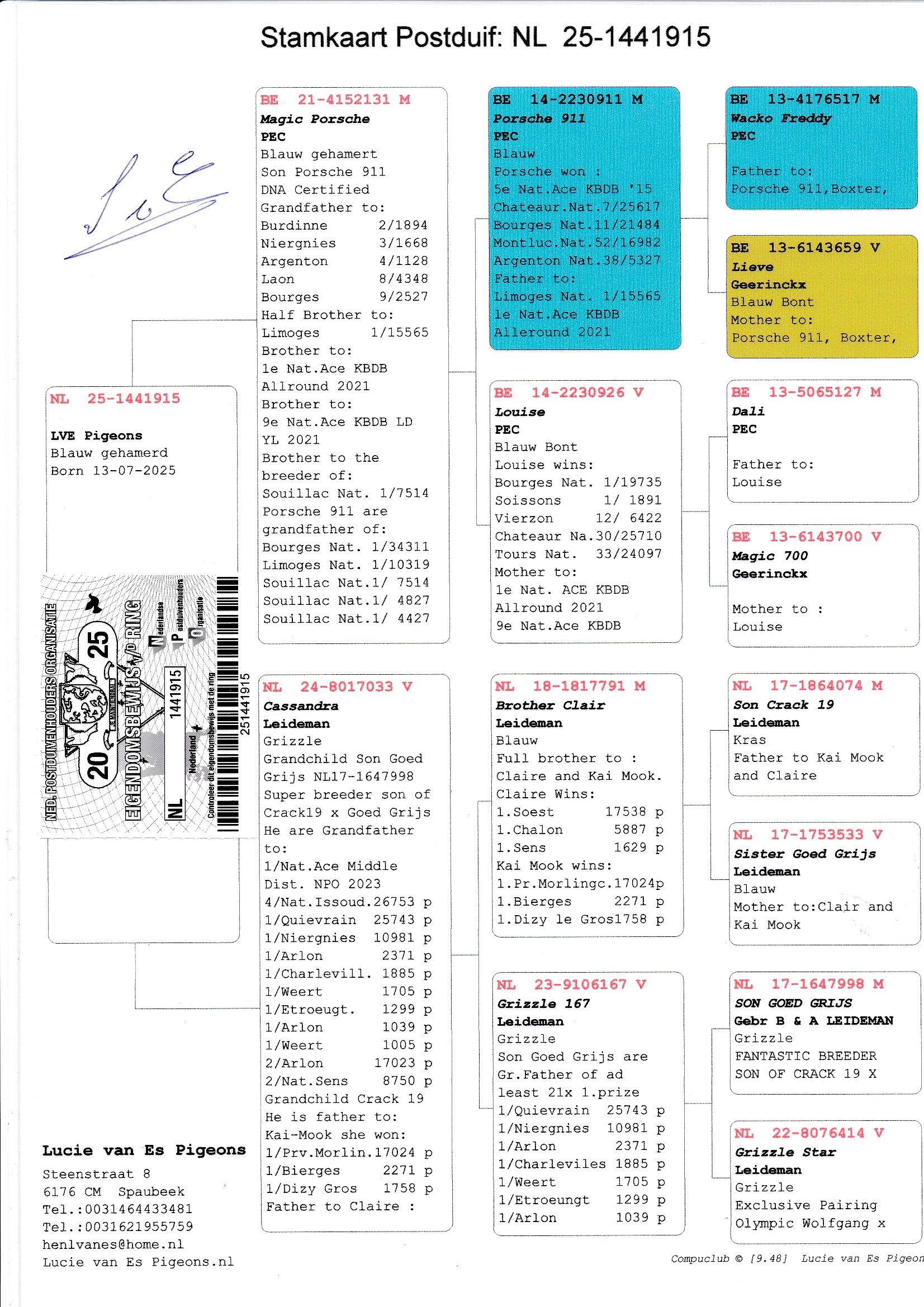 Uit: ”Magic Porsche”, zoon ”Porsche 911”, 5. Nat. Asduif KBDB & PEC Superkweker, zoon ”Louise”, 1. Nat. Bourges 19.735 d. x ”Cassandra”, uit dubbele kld. ”Goed Grijs”, 7x 1. Prijs & 1. NPO Laon 6.371 d., uit broer ”Claire”
