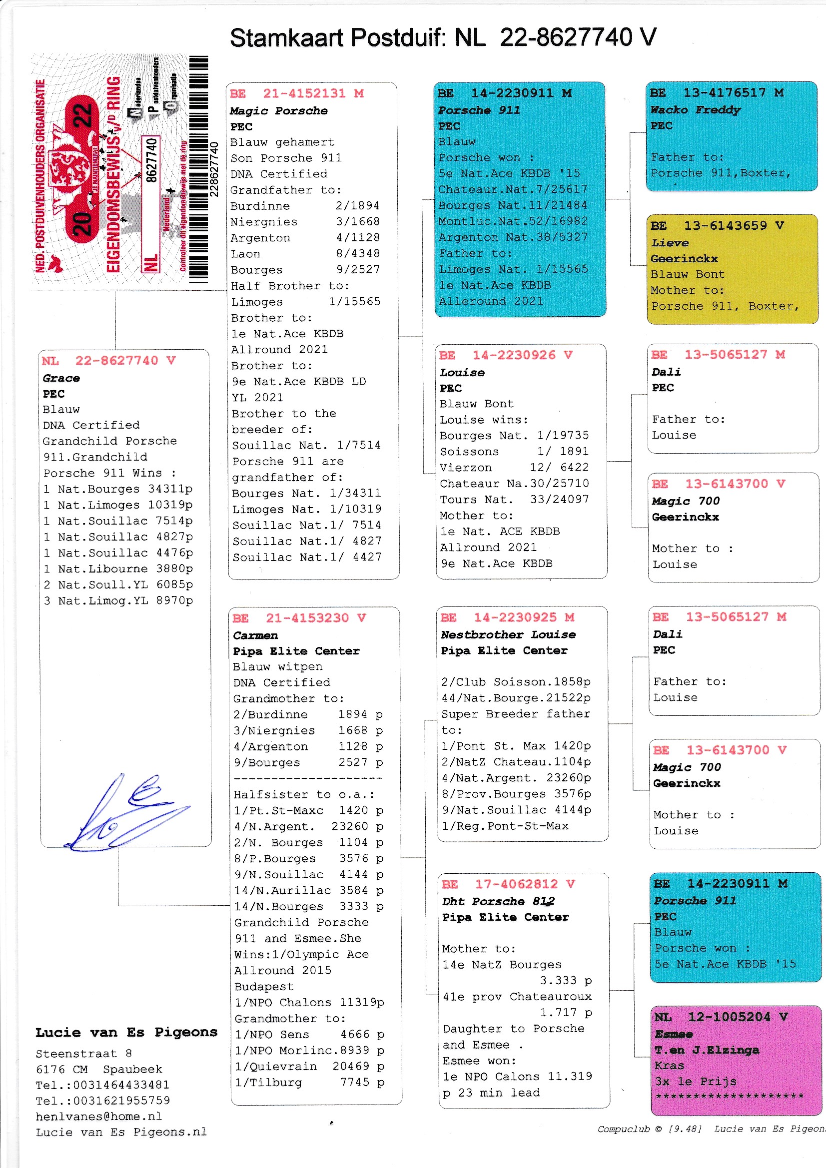 Uit: ”Magic Porsche”, gr-vader 2.-1.894 d., 3.-1.668 d., 4.-1.128 d., zoon ”Porsche 911”, 5. Nat. Asduif KBDB, zoon ”Louise”, 1. Nat. Bourges 19.735 d. x ”Carmen”, uit dochter ”Porsche 911” & ”Esmee”, 1. Nat. Asduif