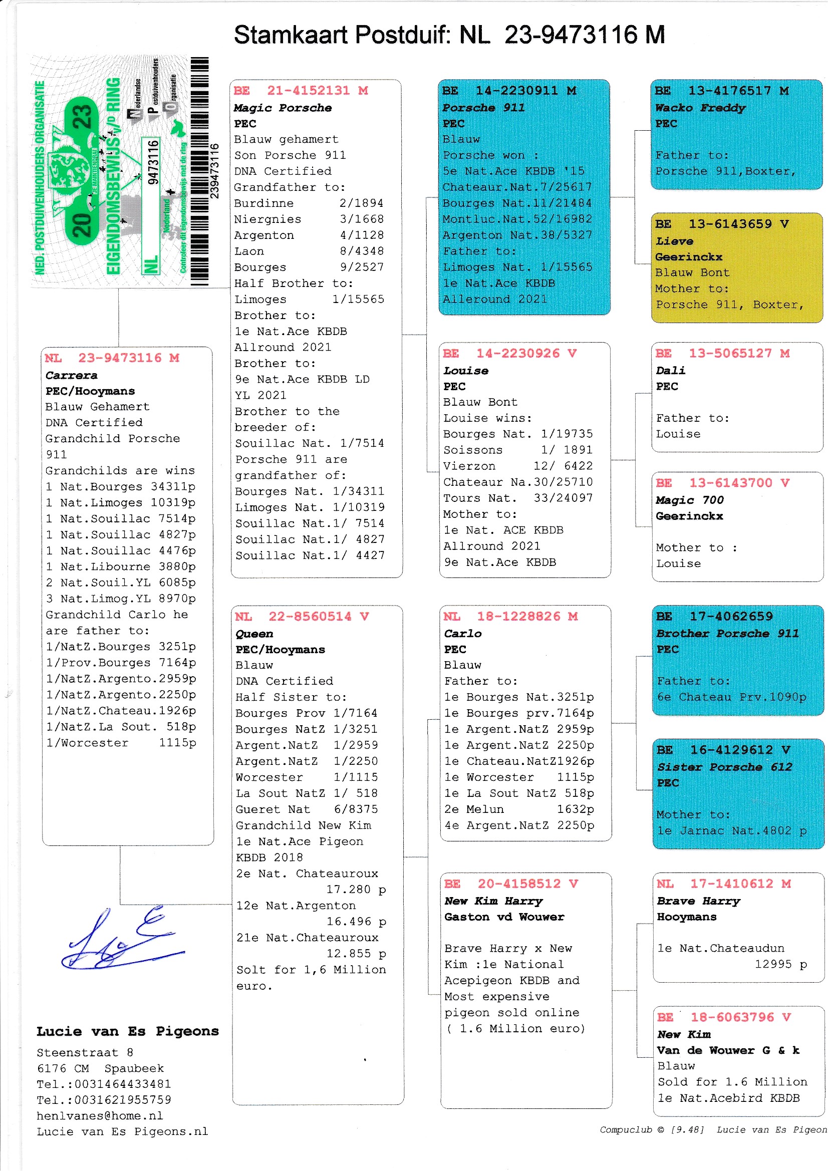 Uit: ”Magic Porsche”, gr-vader 2.-1.894 d., 3.-1.668 d., 4.-1.128 d., zoon ”Porsche 911”, 5. Nat. Asduif KBDB, zoon ”Louise”, 1. Nat. Bourges 19.735 d. x ”Queen”, 1/2 zus 5x 1. Prijs gemiddeld 3.000 d., uit dochter ”New Kim”