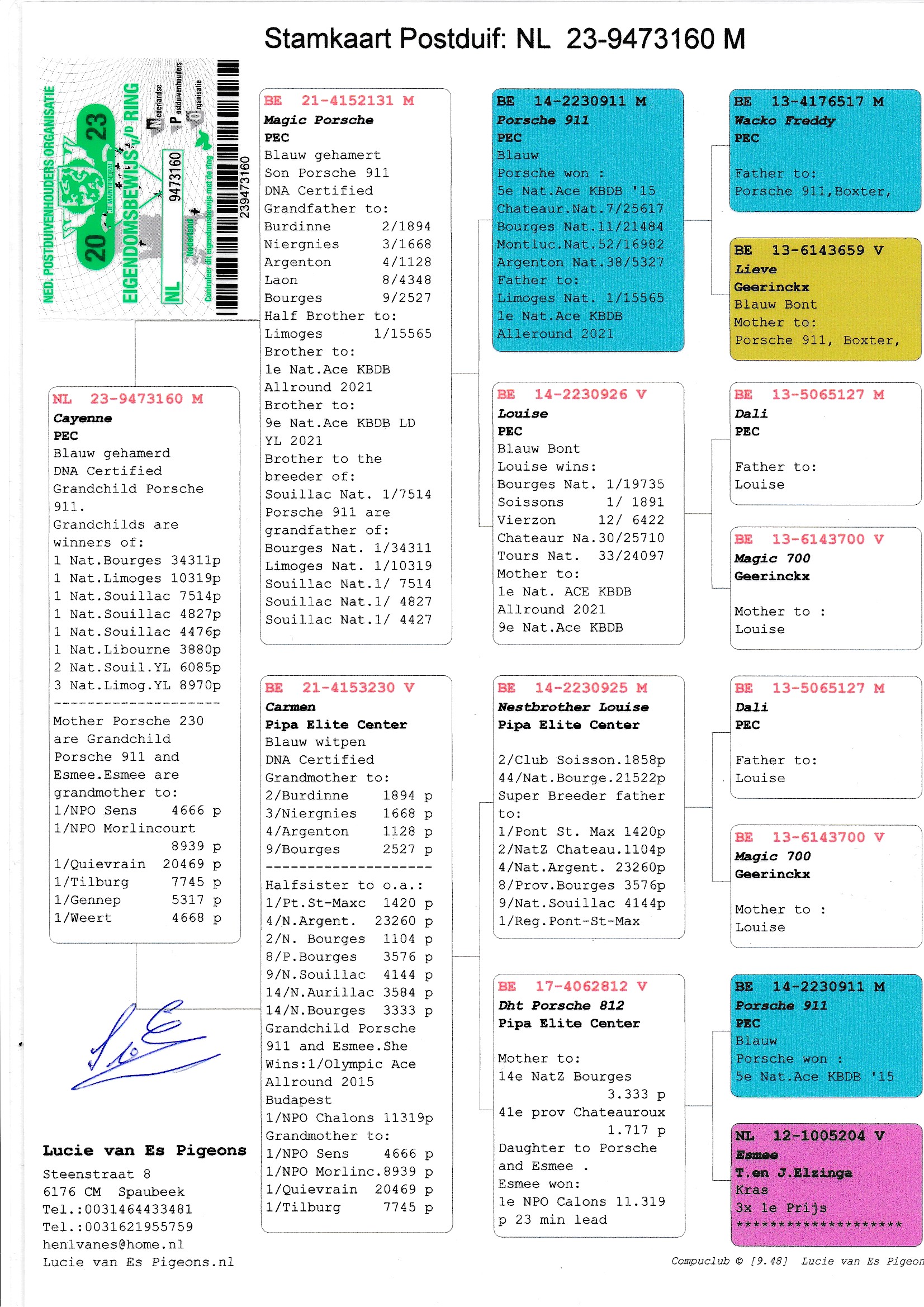 Uit: ”Magic Porsche”, gr-vader 2.-1.894 d., 3.-1.668 d., 4.-1.128 d., zoon ”Porsche 911”, 5. Nat. Asduif KBDB, zoon ”Louise”, 1. Nat. Bourges 19.735 d. x ”Carmen”, uit dochter ”Porsche 911” & ”Esmee”, 1. Nat. Asduif