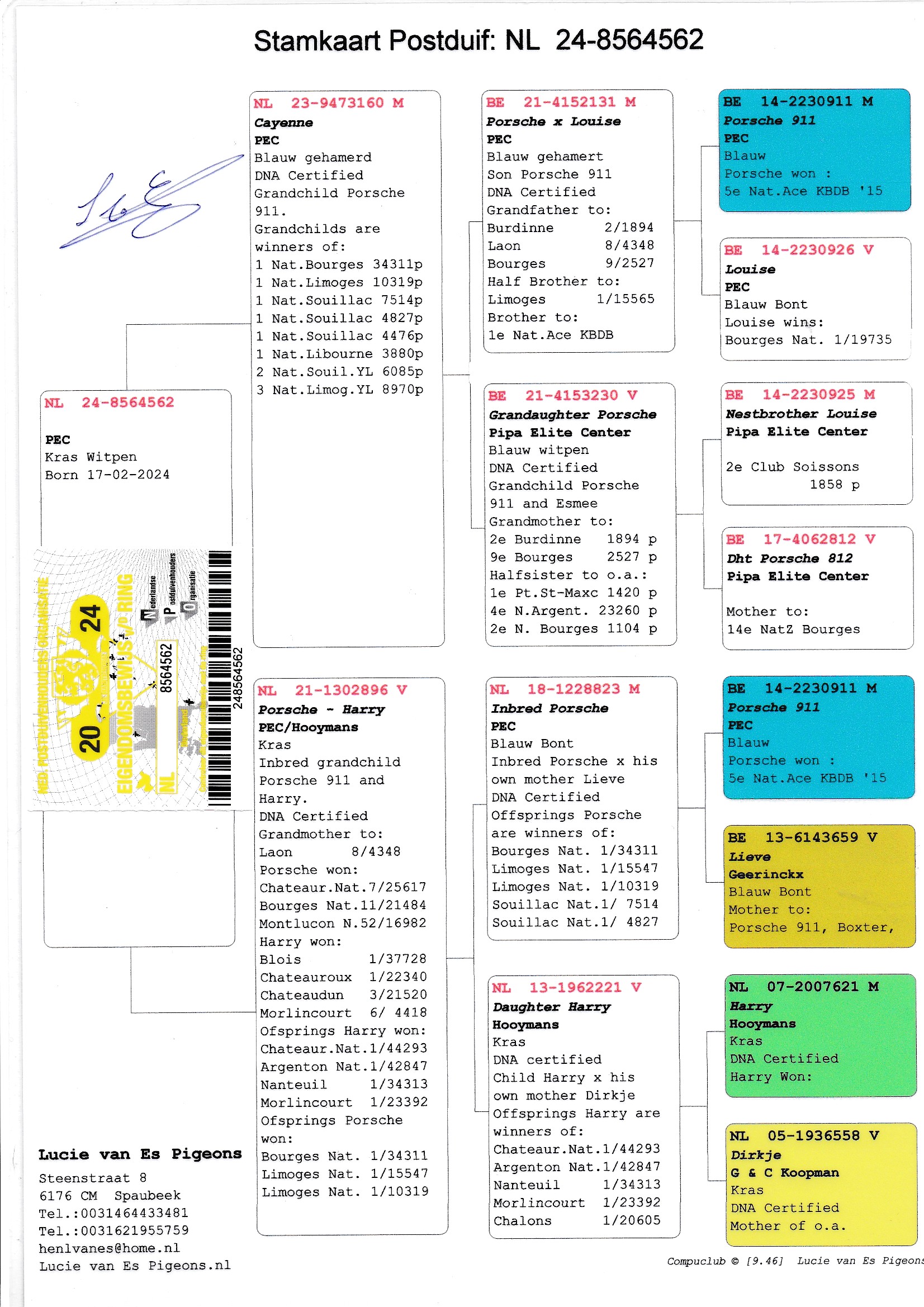 Uit: ”Cayenne”, uit zoon ”Porsche 911”, 5. Nat. Asduif KBDB, uit zoon ”Louise”, 1. Nat. Bourges 19.735 d. x ”Porsche-Harry”, uit zoon ”Porsche 911”, 5. Nat. Asduif KBDB, uit dochter ”Harry”, 1. Nat. Asduif Dagfond WHZB