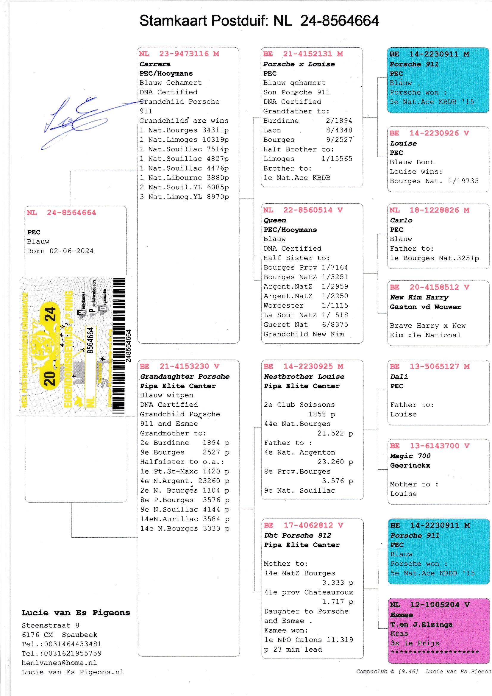 Uit: ”Carrera”, uit zoon ”Porsche 911”, 5. Nat. Asduif KBDB, uit zoon ”Louise”, 1. Nat. Bourges 19.735 d. x ”Granddaughter Porsche”, uit dochter ”Porsche 911”, 5. Nat. Asduif KBDB, uit dochter ”Esmee”, 1. Nat. Asduif