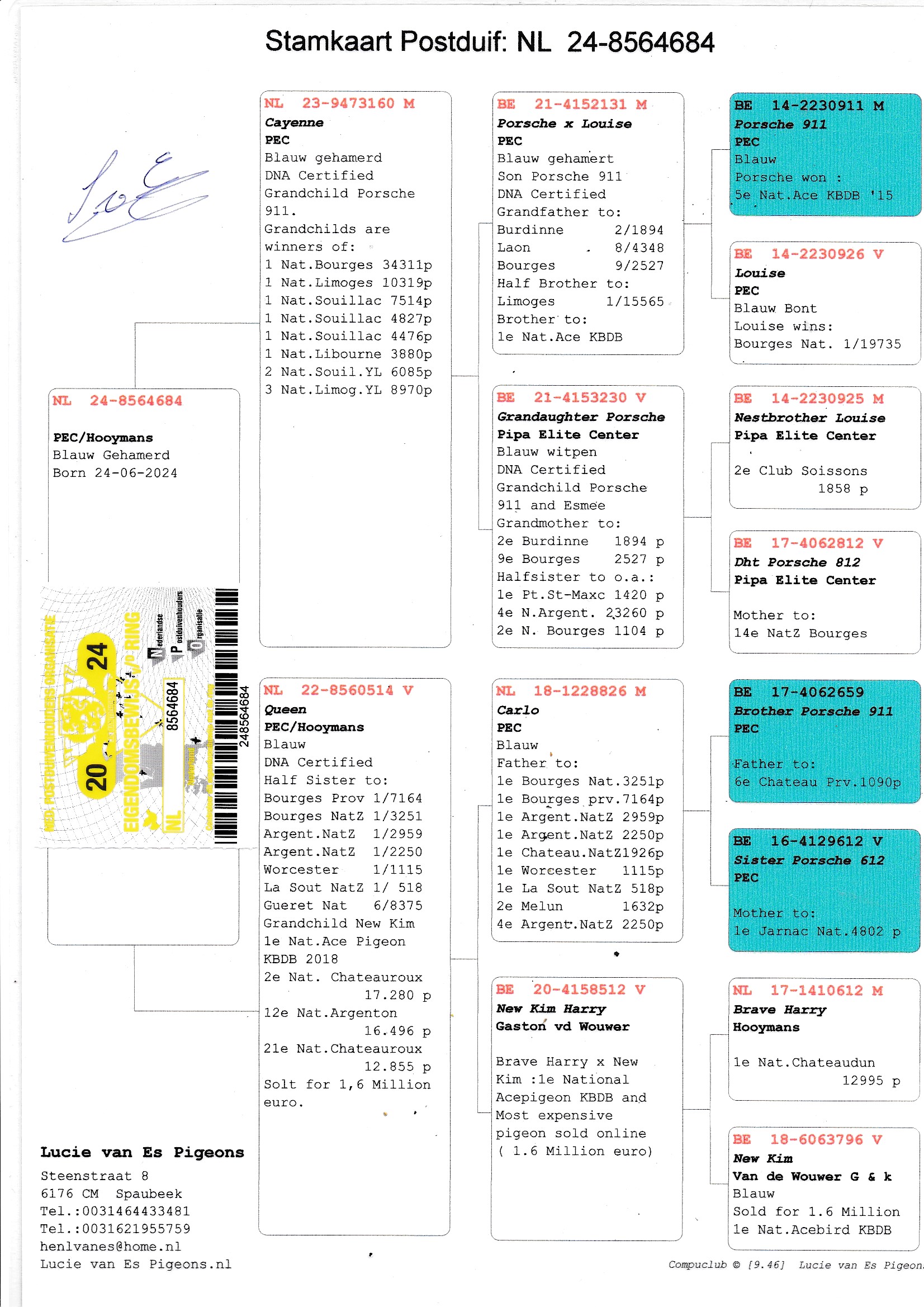 Uit: ”Cayenne”, uit zoon ”Porsche 911”, 5. Nat. Asduif KBDB, uit zoon ”Louise”, 1. Nat. Bourges 19.735 d. x ”Queen”, 1/2 zus 5x 1. Prijs gemiddeld 3.000 d., uit dochter ”New Kim”, 1. Nat. Asduif KBDB, uit dochter ”Brave Harry”