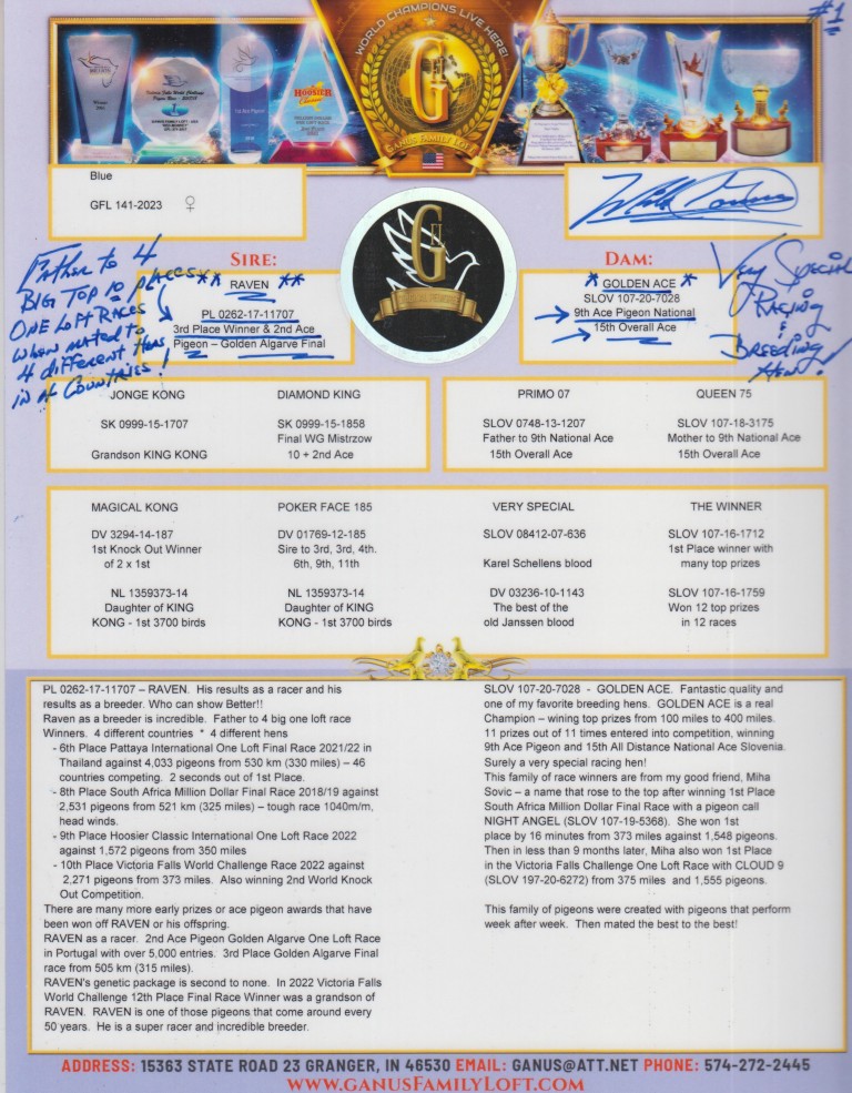 Uit: ”Raven”, 2. Asduif & 3. Finale OLR Golden Algarve, vader 6. Finale OLR PIPR Pattaya, 8. Finale OLR SAMDR, 10. Finale OLR Victoria Falls x ”Golden Ace”, 9. & 15. Nat. Asduif, lijn ”Night Angel”, 1. Finale OLR SAMDR