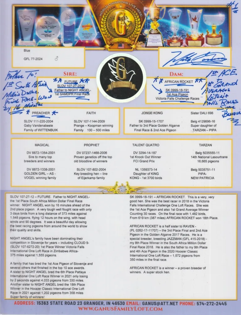 Uit: ”Future”, vader ”Night Angel”, 1. Finale OLR SAMDR x ”African Rocket”, 1. Asduif & Grand Average Victoria Falls, 18. Finale OLR Victoria Falls 1.482 d., 1/2 zus ”Raven”, 2. Asduif & 3. Finale OLR Golden Algarve