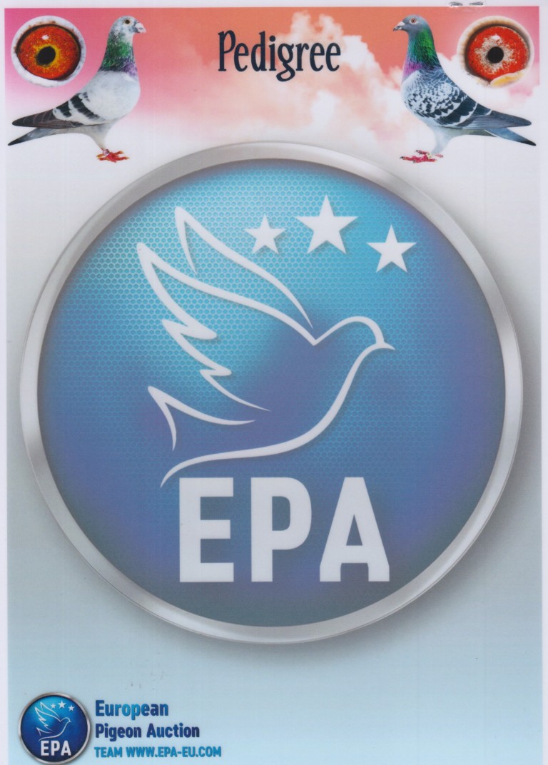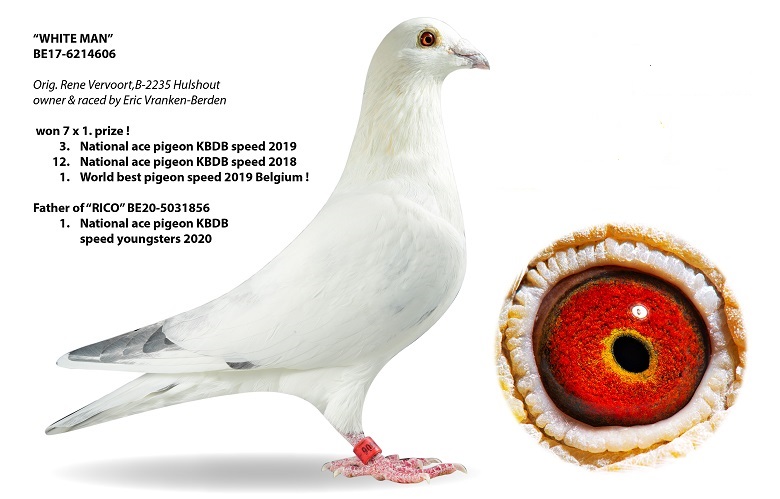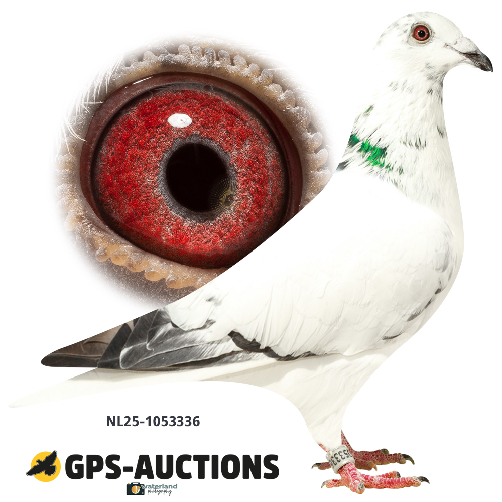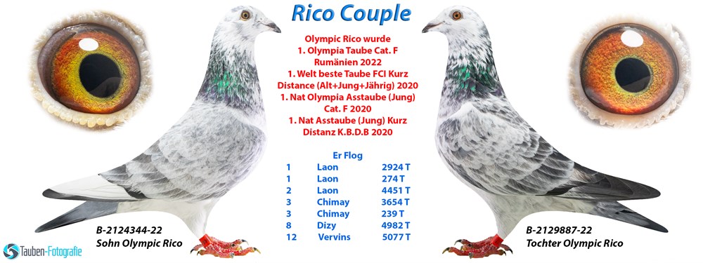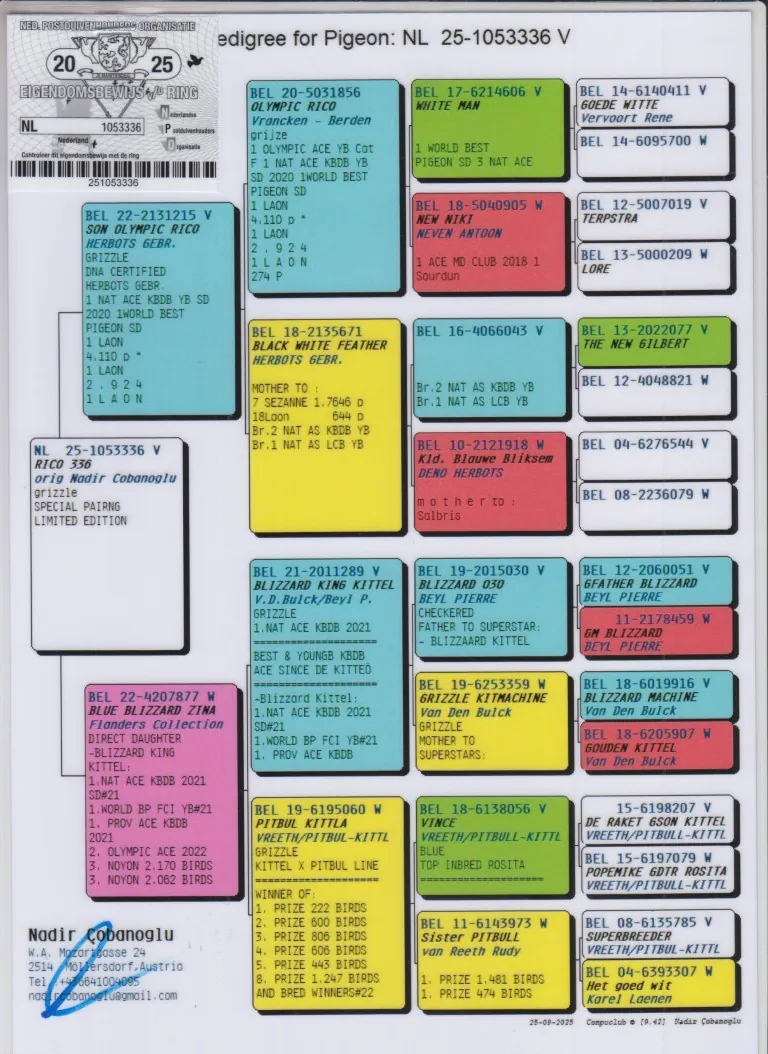 “Rico 336”, uit “The 215”, zoon “Olympic Rico”, 1. Nat. KBDB, 1. Olympiade Duif & “Black White Feather” x “Blue Blizzard Zina”, uit “Blizzard King Kittel”, 1. Nat. Asduif KBDB.