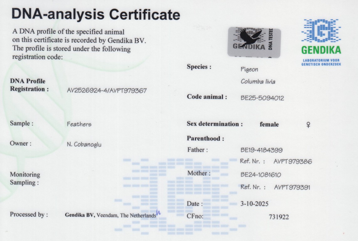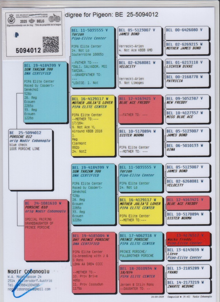 Grootvader: B19-4184399. Zoon ‘Tarzan 399’, DNA certified. Pipa Elite Center.