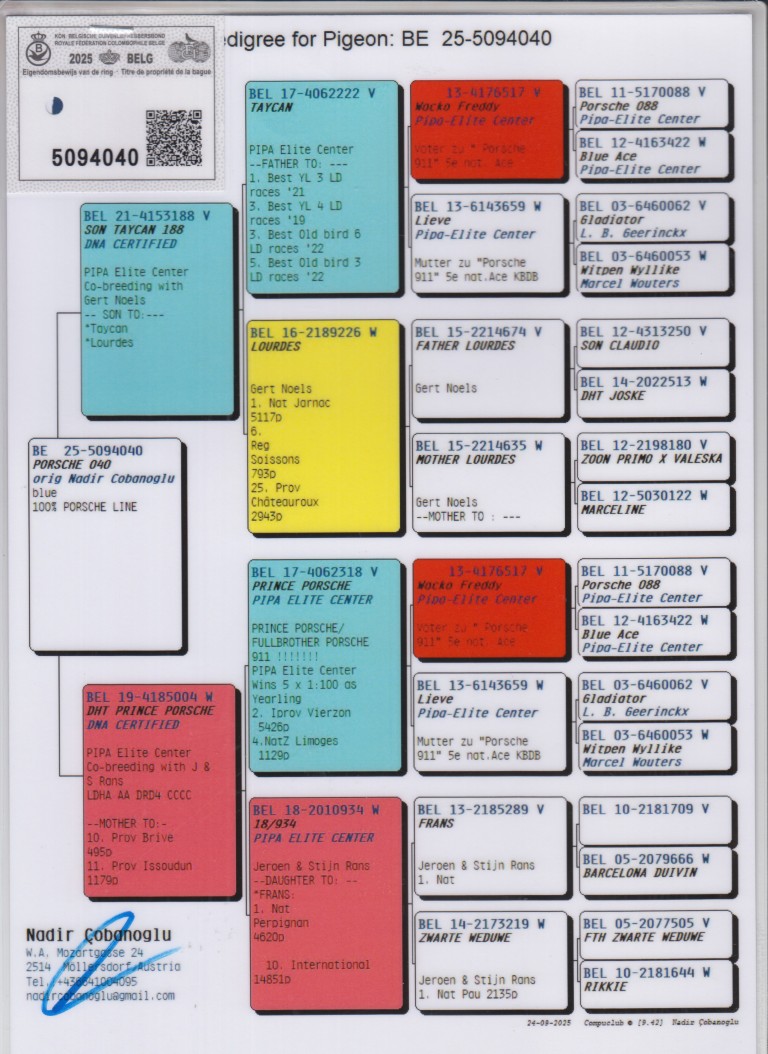 Uit: ”Son Taycan 188”, zoon ”Taycan”, vader 1.-3.-3.-5. Nat. Asduif België, zoon ”Lourdes”, 1. Nat. Jarnac 5.117 d. x ”Dht. Prince Porsche”, moeder 10. Prov. Brive, 11. Prov. Issoudun, dochter ”Prince Porsche”, OLR Wonderkweker