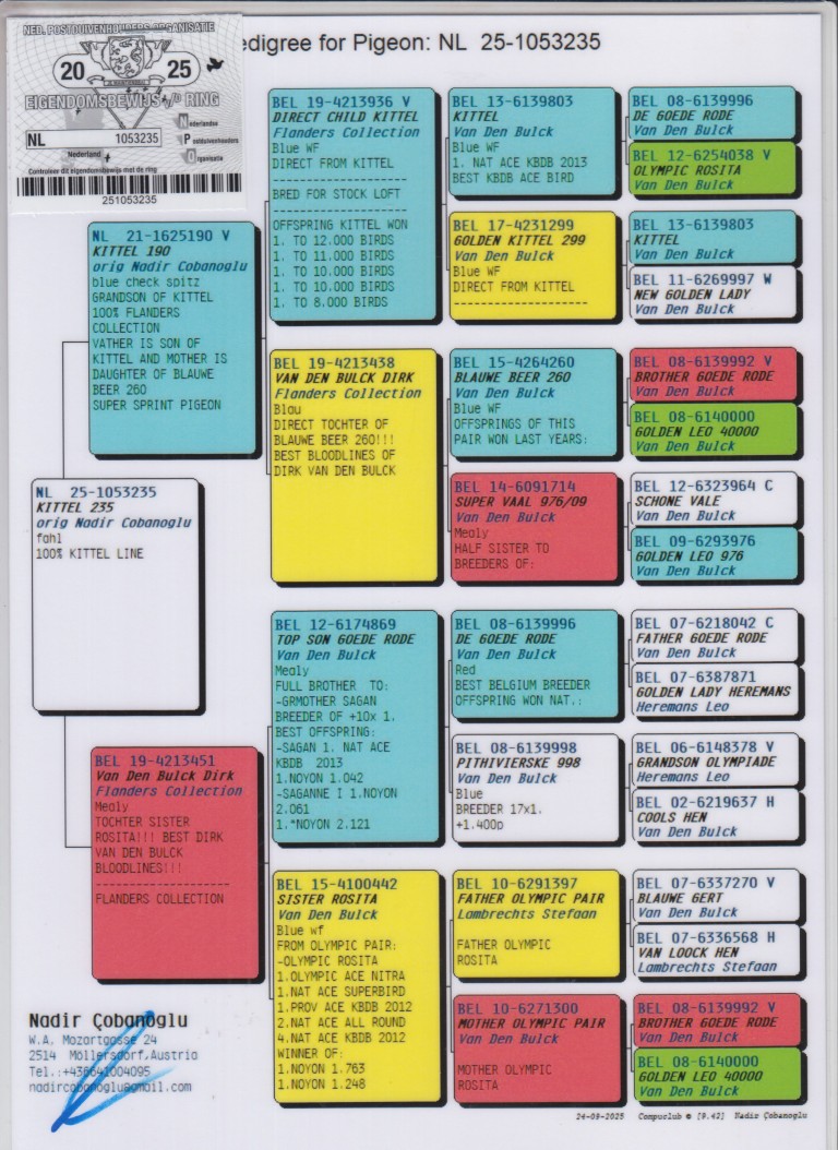 Uit: ”Kittel 190”, uit zoon ”Kittel”, 1. Nat. Asduif Sprint KBDB & legendarische kweker x ”van den Bulck Dirk”, uit zus ”Olympic Rosita”, 1. Olympiade duif Cat. Snelheid & moeder ”Kittel”, 1. Nat. Asduif Sprint KBDB