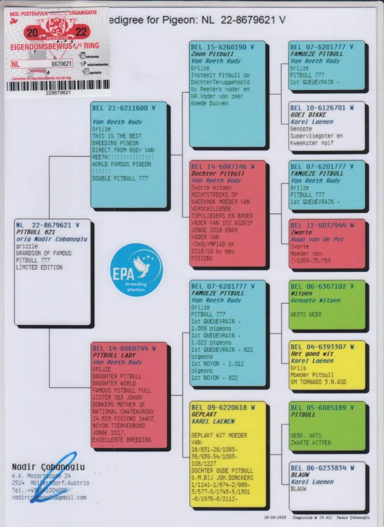 Grootvader BE15-6260190. Zoon “Pitbull”. Van Reeth Rudy