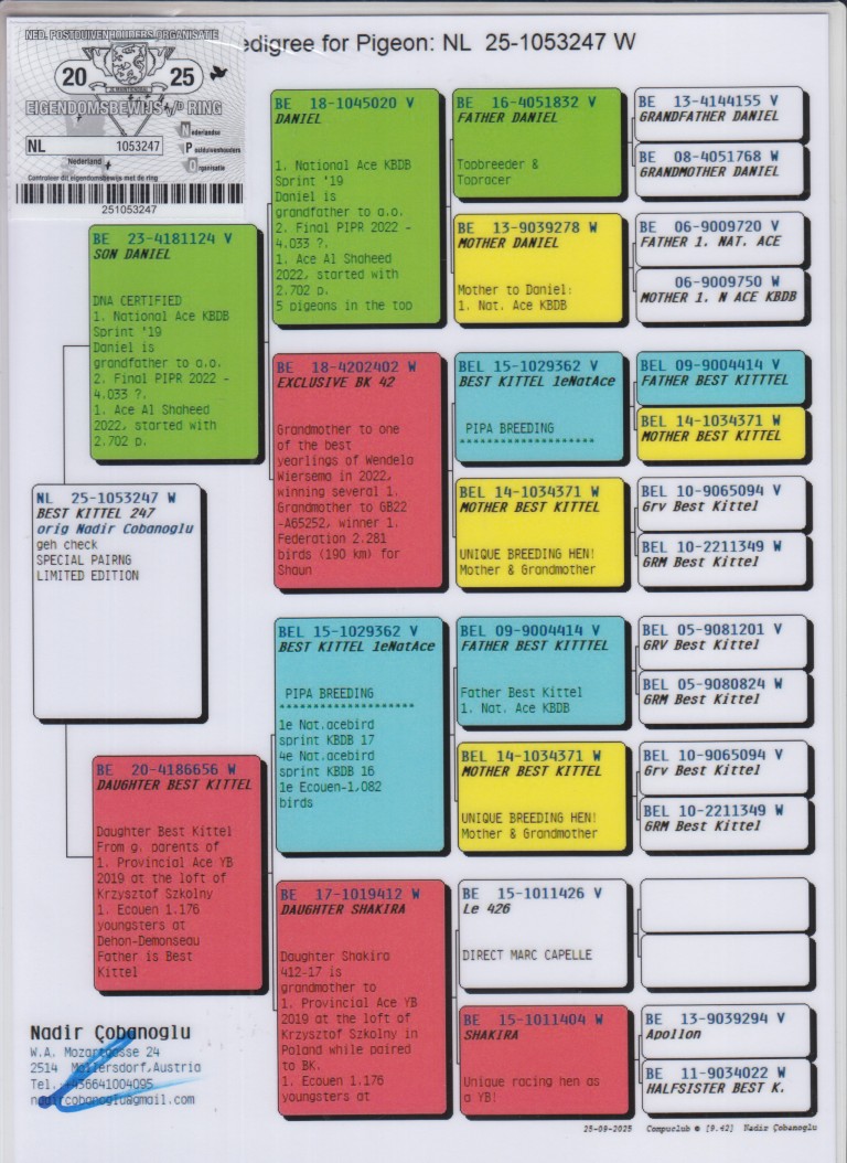 “Best Kittel 247”, uit ”Son Daniël”, 1. Nat. Asduif KBDB Sprint & dochter ”Best Kittel”, 1. Nat. Asduif Sprint KBDB x ”Daughter Best Kittel”, 1.+4. Nat. KBDB & dochter “Shakira”.