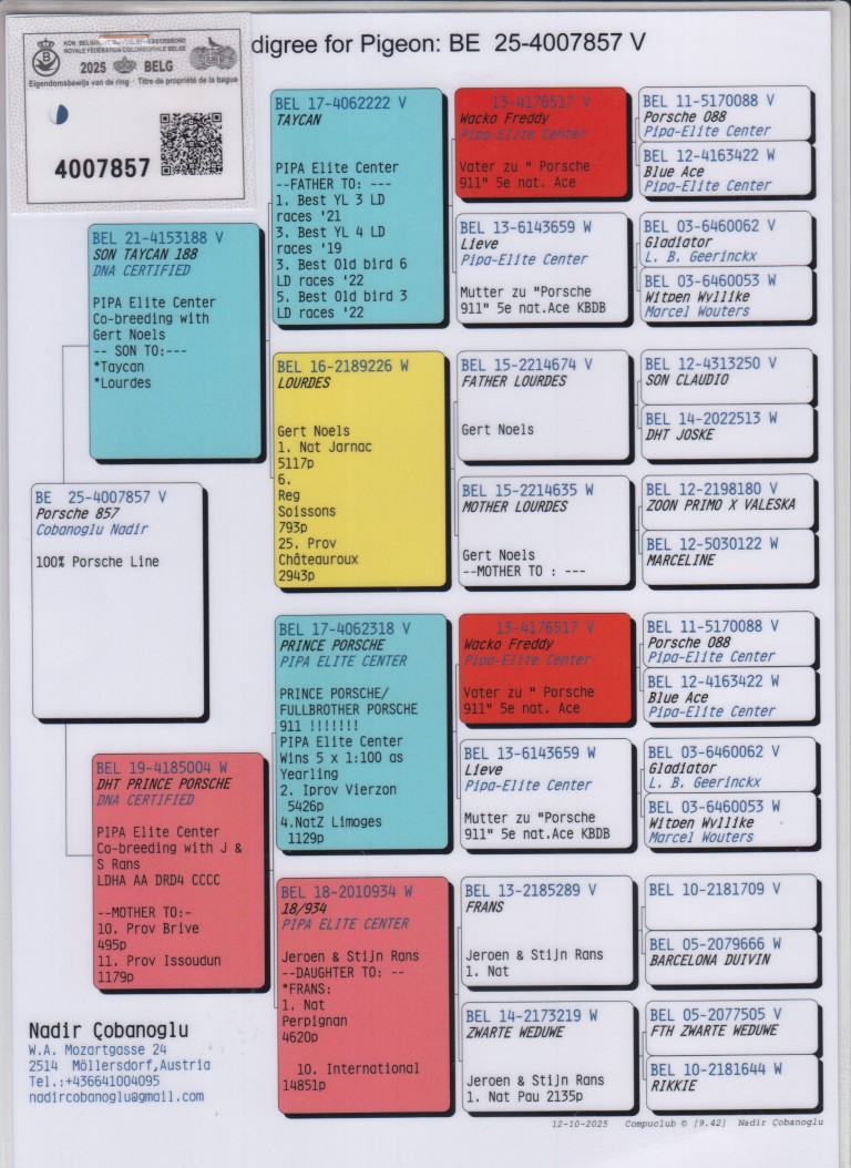 Uit: ”Son Taycan 188”, zoon ”Taycan”, vader 1.-3.-3.-5. Nat. Asduif België, zoon ”Lourdes”, 1. Nat. Jarnac 5.117 d. x ”Dht. Prince Porsche”, moeder 10. Prov. Brive, 11. Prov. Issoudun, dochter ”Prince Porsche”, OLR Wonderkweker