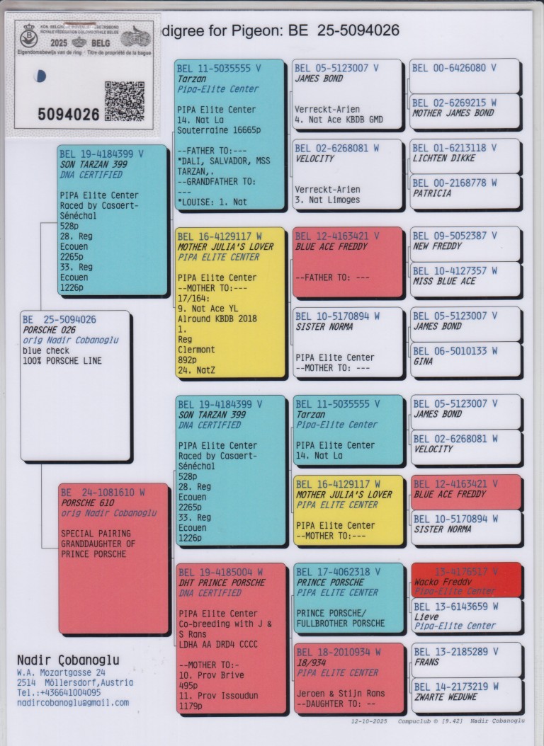 Uit: ”Son Tarzan 399”, zoon ”Tarzan”, 14. Nat. La Souterraine 16.665 d., vader ”Dali”, ”Salvador”, ”Miss Tarzan”, gr-vader ”Louise”, 1. Nat. Bourges 19.735 d. x ”Porsche 610”, uit dochter ”Prince Porsche”, OLR Wonderkweker