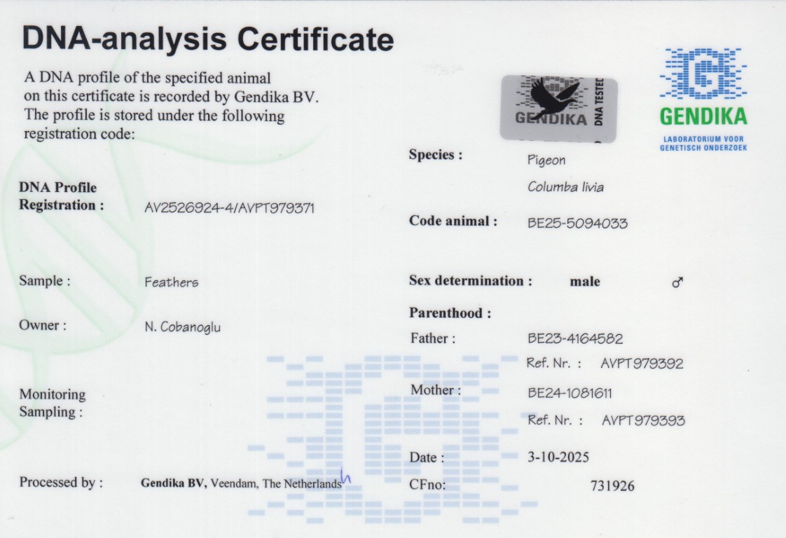 Grootvader: B19-4184399. Zoon ‘Tarzan 399’, DNA certified. Pipa Elite Center.