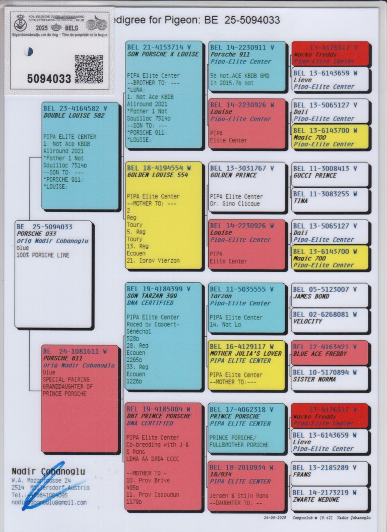 Uit: ”Double Louise 582”, uit zoon ”Porsche 911” & ”Louise”, uit dochter ”Golden Prince”, 1. Nat. Asduif Fond KBDB & ”Louise” x ”Porsche 611”, uit dochter ”Prince Porsche”, OLR Wonderweker, uit zoon ”Tarzan”
