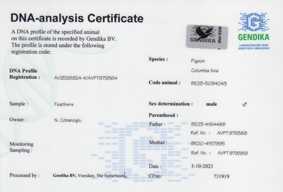 Grootvader: B15-4013418. Broer ‘Dali 418/15’, Zoon ‘Tarzan’. Pipa Elite Center.