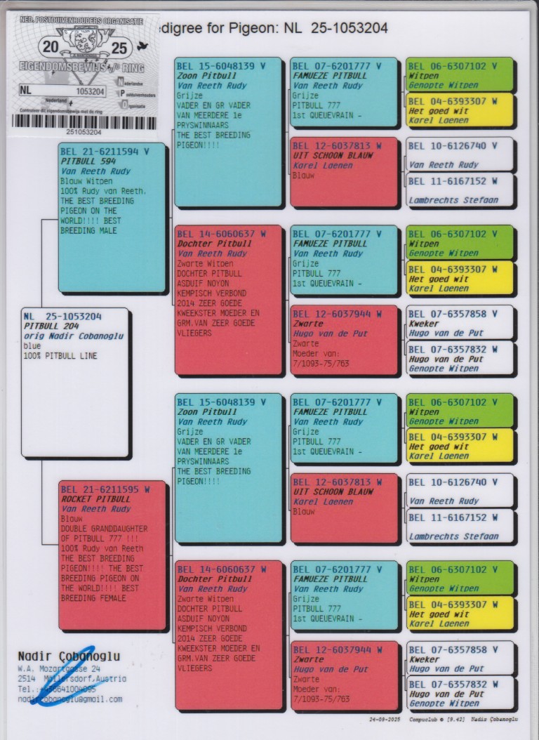 Uit: ”Pitbull 594”, uit zoon & dochter legendarische ”Pitbull”, nazaten winnen: 1.-1.-1.-1.-2.-2.-2.-2.-3.-3.-3.-3.-4. Nat. Asduif & Olympiade duif x ”Rocket Pitbull”, uit zoon & dochter ”Pitbull”