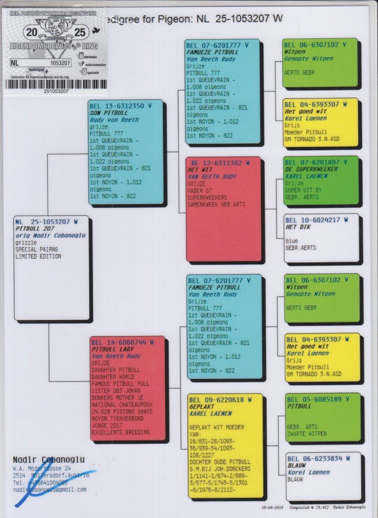 Uit: ”Son Pitbull”, zoon ”Pitbull”, nazaten winnen: 1.-1.-1.-1.-1.-1.-2.-2.-2.-2.-3.-3.-3. Nat. Asduif & Olympiade duif x ”Pitbull Lady”, dochter ”Pitbull”, legendarische kweker, nazaten 4x 1. Nat. Asduif!