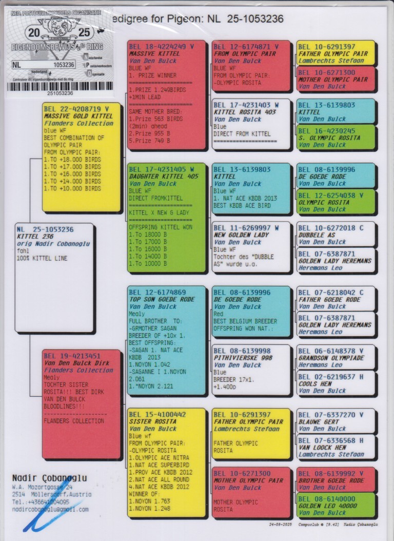 Uit: ”Massive Gold Kittel”, zoon ”Massive Kittel”, 1. Prijs 1.249 d., uit dochter ”Kittel”, 1. Nat. Asduif Sprint KBDB 2013 x ”van den Bulck Dirk”, uit zus ”Olympic Rosita”, 1. Olympiade duif Cat. Sprint & moeder ”Kittel”
