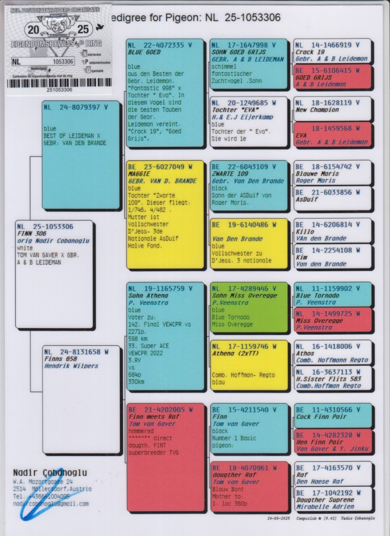 Uit: ”De 397”, uit zoon ”Son Goed Grijs 998”, gr-vader ”Nieuw Goed Grijs”, 1. Nat. Asduif Midfond NPO x ”Finns 658”, 1/2 zus 33. Super Asduif Victoria Falls, uit dochter ”Finn”, Nummer 1 Stamvader Tom van Gaver