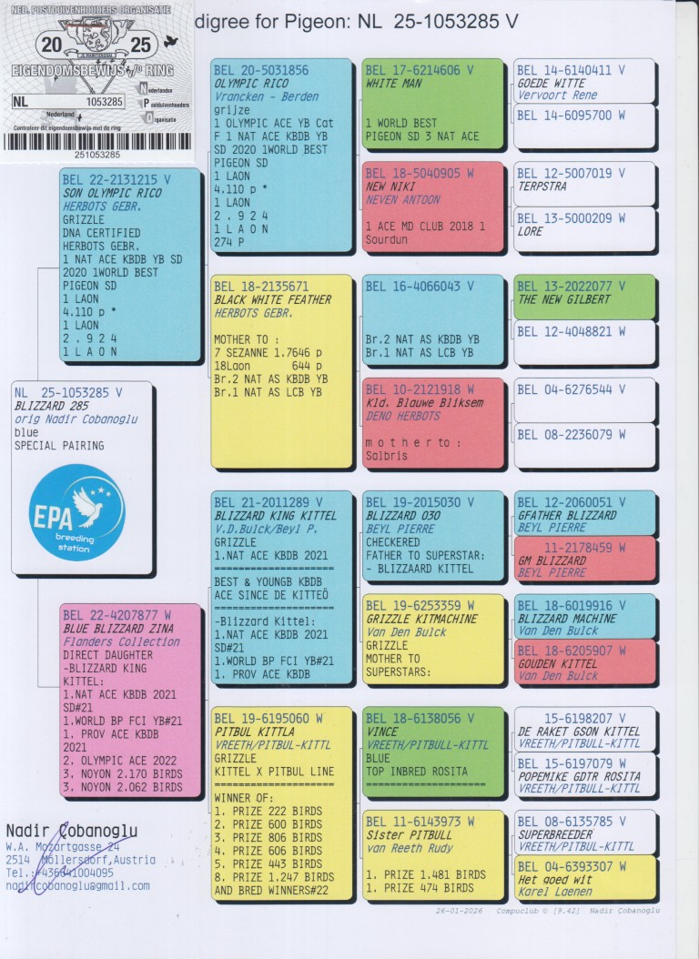 Uit: ”Son Olympic Rico”, zoon ”Olympic Rico”, 1. Int. Asduif FCI, 1. Nat. Asduif KBDB, 1. Olympiade duif x ”Blue Blizzard Zina”, dtr. ”Blizzard King Kittel”, 1. Nat. Asduif KBDB & vader ”Unicum Blizzard”, 1. Nat. Asduif KBDB