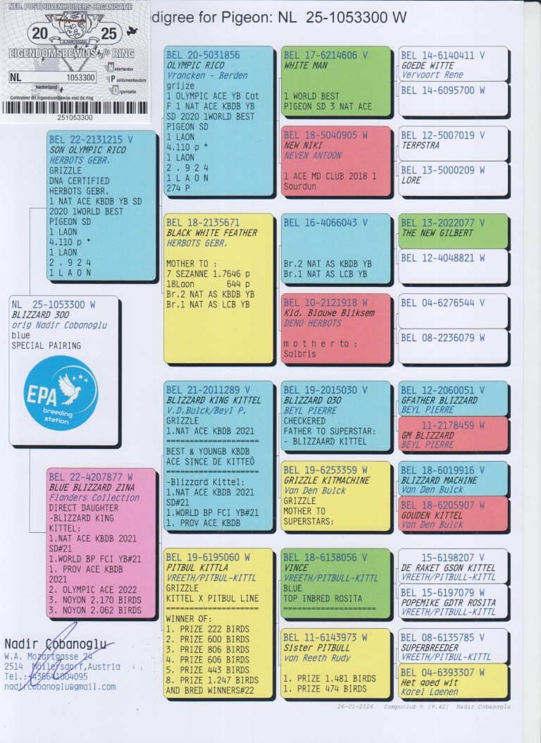 Uit: ”Son Olympic Rico”, zoon ”Olympic Rico”, 1. Int. Asduif FCI, 1. Nat. Asduif KBDB, 1. Olympiade duif x ”Blue Blizzard Zina”, dtr. ”Blizzard King Kittel”, 1. Nat. Asduif KBDB & vader ”Unicum Blizzard”, 1. Nat. Asduif KBDB