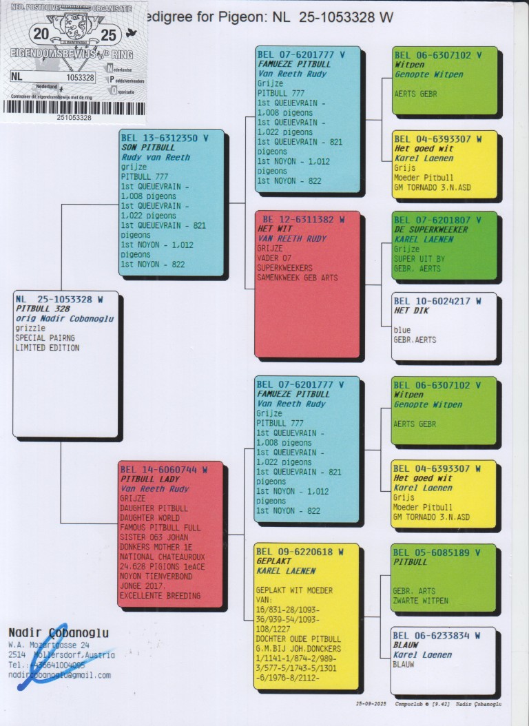Uit: ”Son Pitbull”, zoon ”Pitbull”, nazaten winnen: 1.-1.-1.-1.-1.-1.-2.-2.-2.-2.-3.-3.-3. Nat. Asduif & Olympiade duif x ”Pitbull Lady”, dochter ”Pitbull”, legendarische kweker, nazaten 4x 1. Nat. Asduif!