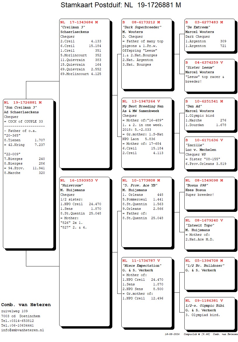 Vader van o.a. “20-365”, 8. Tienen 1.707, = 42.- 7.237, “22-009”, 7.- 240, 8.- 286, = 94. Prov. – 11.941, 8. – 320. etc. uit “Creilman 3”, Ad Schaerlaeckens 1.-351, = 2.- 4.133, 6.- 15.184, 5.- 352, 11.- 383 etc. x “Huisvrouw”, M. Huijsmans 1/2 zus: 1. NPO Creil 24.470, 1. Sens 1.870, 8. St. Quentin 25.048, moeder o.a. “826”, 2x 1.