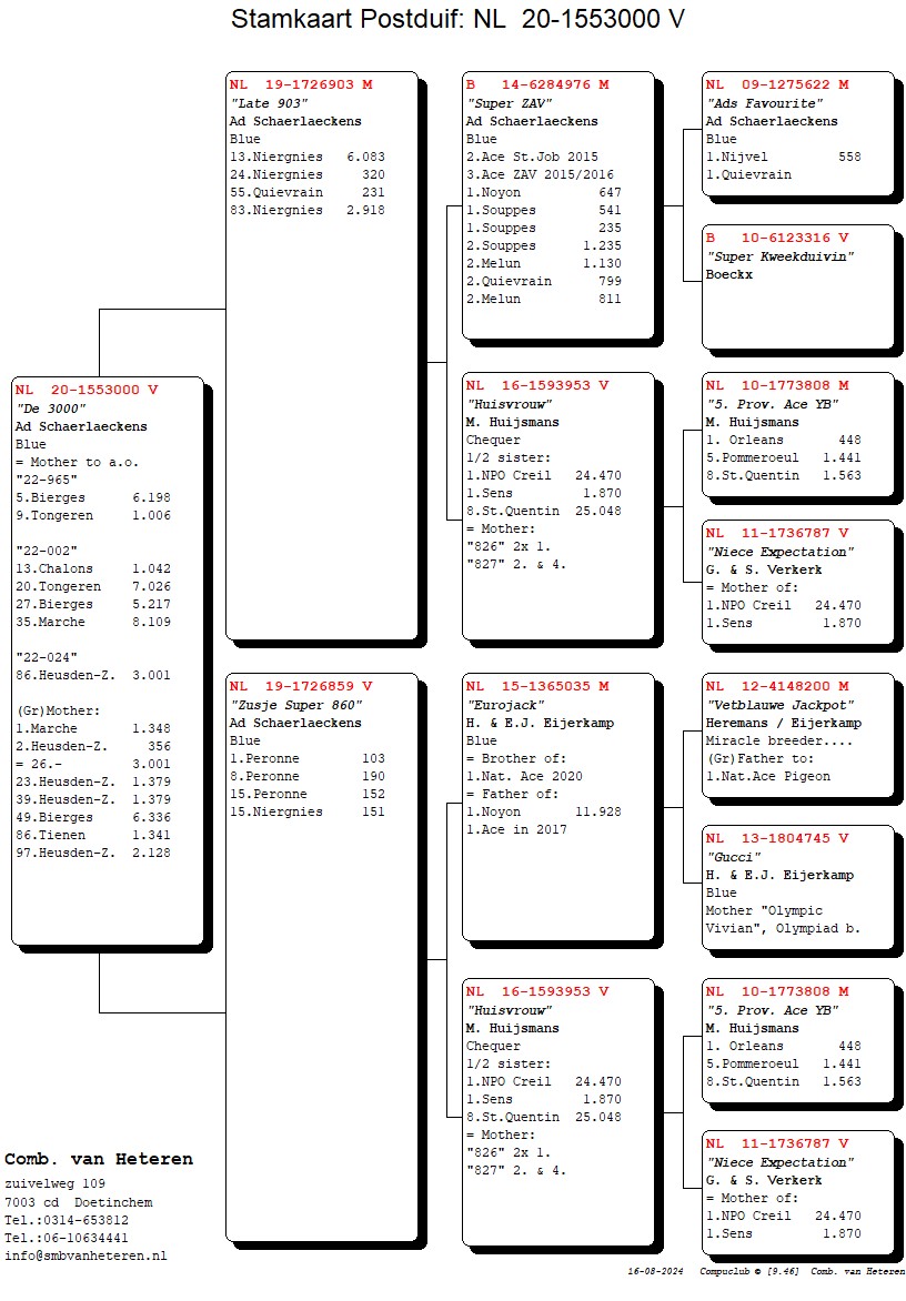 Moeder van o.a. “22-965”, 5. Bierges 6.198, 9. Tongeren 1.006 etc. “22-002”, 13.- 1.042, 20. – 7.026, 27.- 5.217, 35.- 8.109, etc. (Gr)-moeder: 1.- 1.348, 2.- 356, = 26.- 3.001, 23. & 39. – 1.379, 49. – 6.336, etc. uit “Late 903”, 13.- 6.083 etc. x “Zusje Super 680”, 1.-103 etc.
