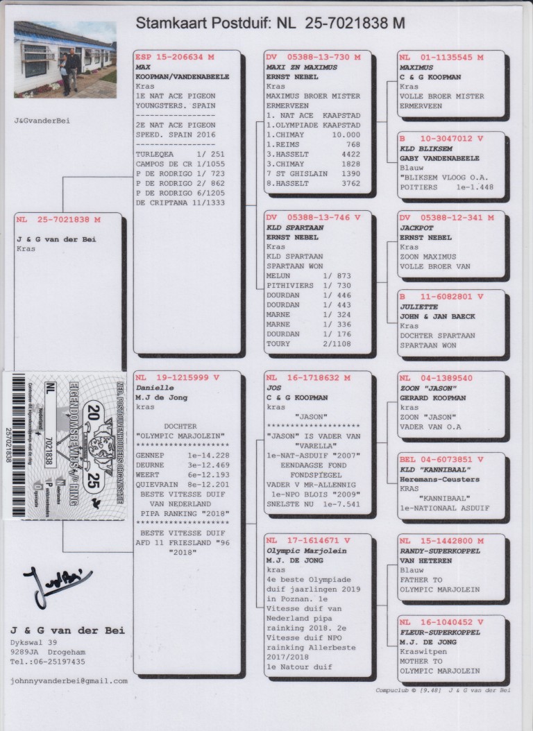 Uit: ”Max”, 1. Nat. Asduif Jonge 2015, 2. Nat. Asduif Sprint 2016, lijn Koopman & Gaby Vandenabeele x ”Danielle”, dochter ”Olympic Marjolein”, 1. Nat. Asduif Sprint PIPA, 2. Nat. Asduif Vitesse ”Allerbeste”, 1. Prov. Asduif