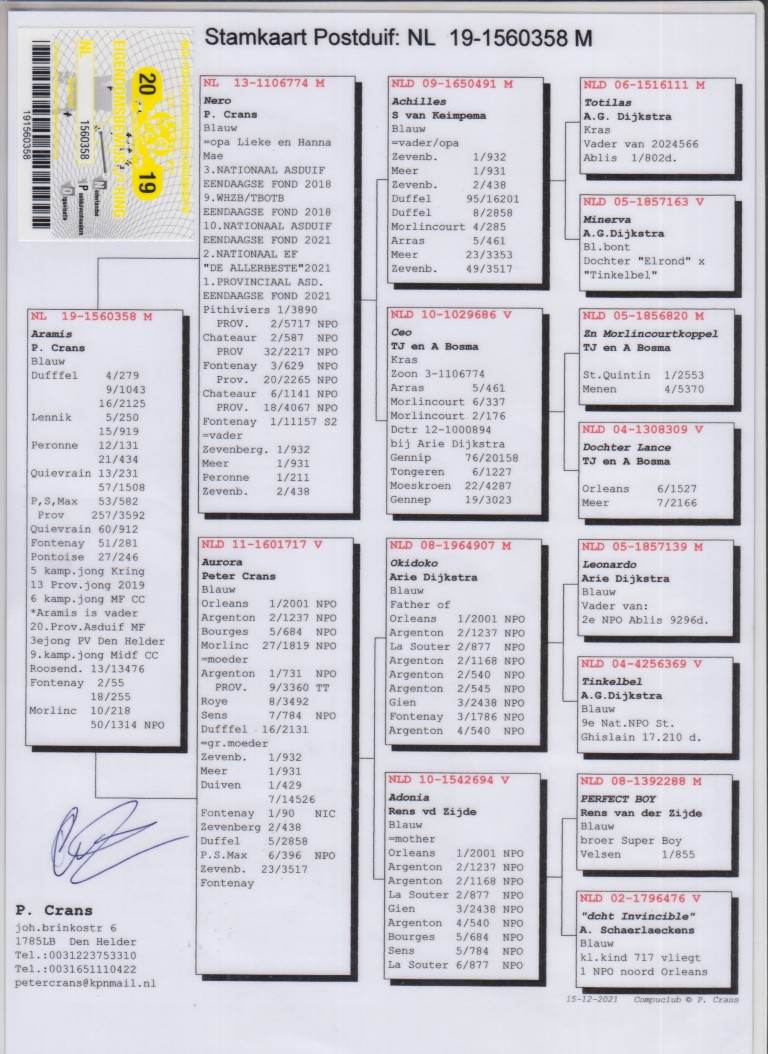 ”Aramis”, 5. Asduif Jonge, 9.-1.043 d., 13. Prov. Asduif Jonge, 15.-919 d., 21.-434 d., 57.-1.508 d., vader 3. Asduif Jonge, 20. Prov. Asduif Jonge, uit: ”Nero”, gr-vader ”Lieke” & ”Hannah Mae” x ”Aurora”, 1. NPO 2.001 d.