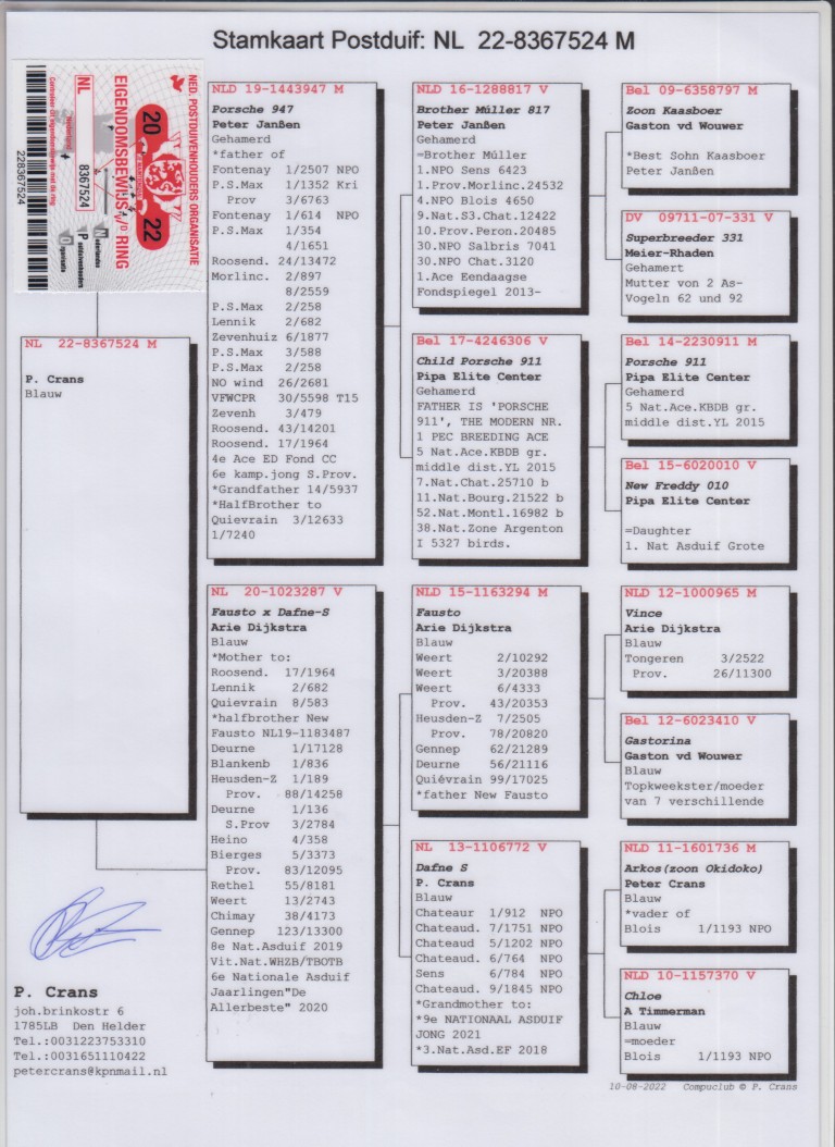 Uit: ”Porsche 947”, (Gr) vader 1. Nat. Asduif Dagfond NPO 2024, 1. NPO 2.507 d., 1.-1.352 d., 1.-1.494 d., 1. NPO 614 d., 1.-354 d. x ”Fausto x Dafne S”, moeder 2.-682 d., 8.-583 d., 17.-1.964 d., dochter ”Fausto” & ”Dafne S”